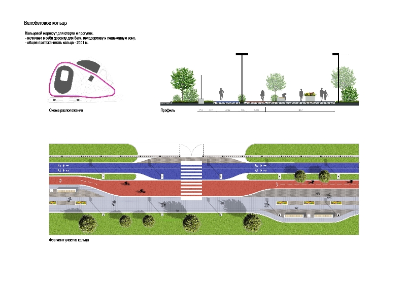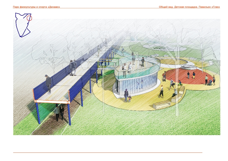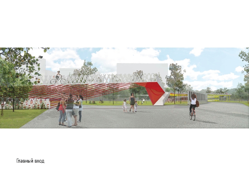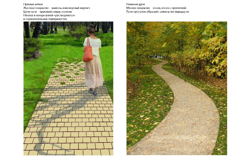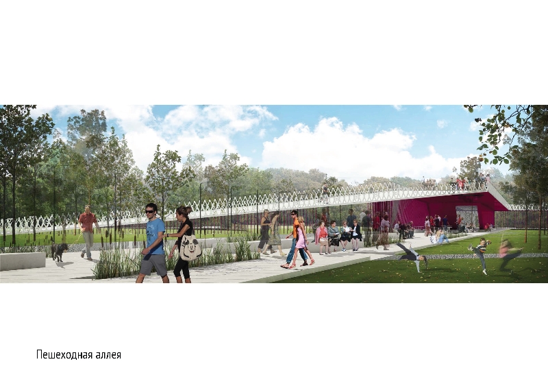 Концепция команды «Поле-дизайн» предполагает значительный объем реконструкционных, восстановительных работ в части существующих пешеходных путей - аллей, дорожек и площадок. Суть этого проекта - восстановить границы парка. Вдоль всей границы парка предлагается организовать галерею - легкую сборную модульную конструкцию, организующую единый навес над проходом по дорожке в уровне земли, а на втором уровне - «непрерывный» путь, оснащенный спусками, пандусами, переходами к формирующимся функциональным зонам и отдельным «тематическим» павильонам.