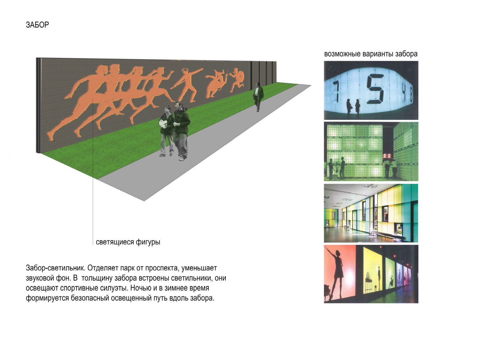 Архитектурно-градостроительная компания Buromoscow предложила вместо попытки отреставрировать несуществующее внедрить забор, который должен стать мостом, аллеей, треком, навесом, катком, горкой, киоском. Широкая смотровая площадка на мосту выходит за пределы исторического парка к Третьему кольцу, делая его заметным городу и оживляя территорию полузаброшенного сквера.
