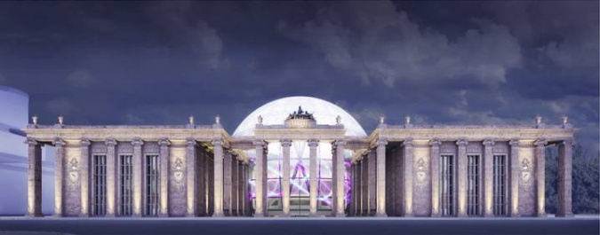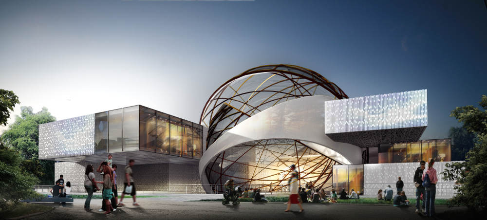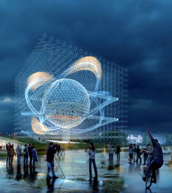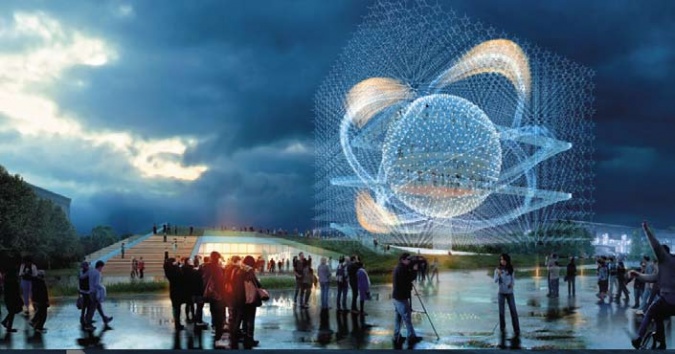 Конструкция павильона располагается на опорах на высоте 6 метров от уровня земли. Служит для защиты музея от осадков. Сфера, диаметром 40 метров, является центральной частью композиции, основой для медиафасада и включает в себя панорамный лекторий.