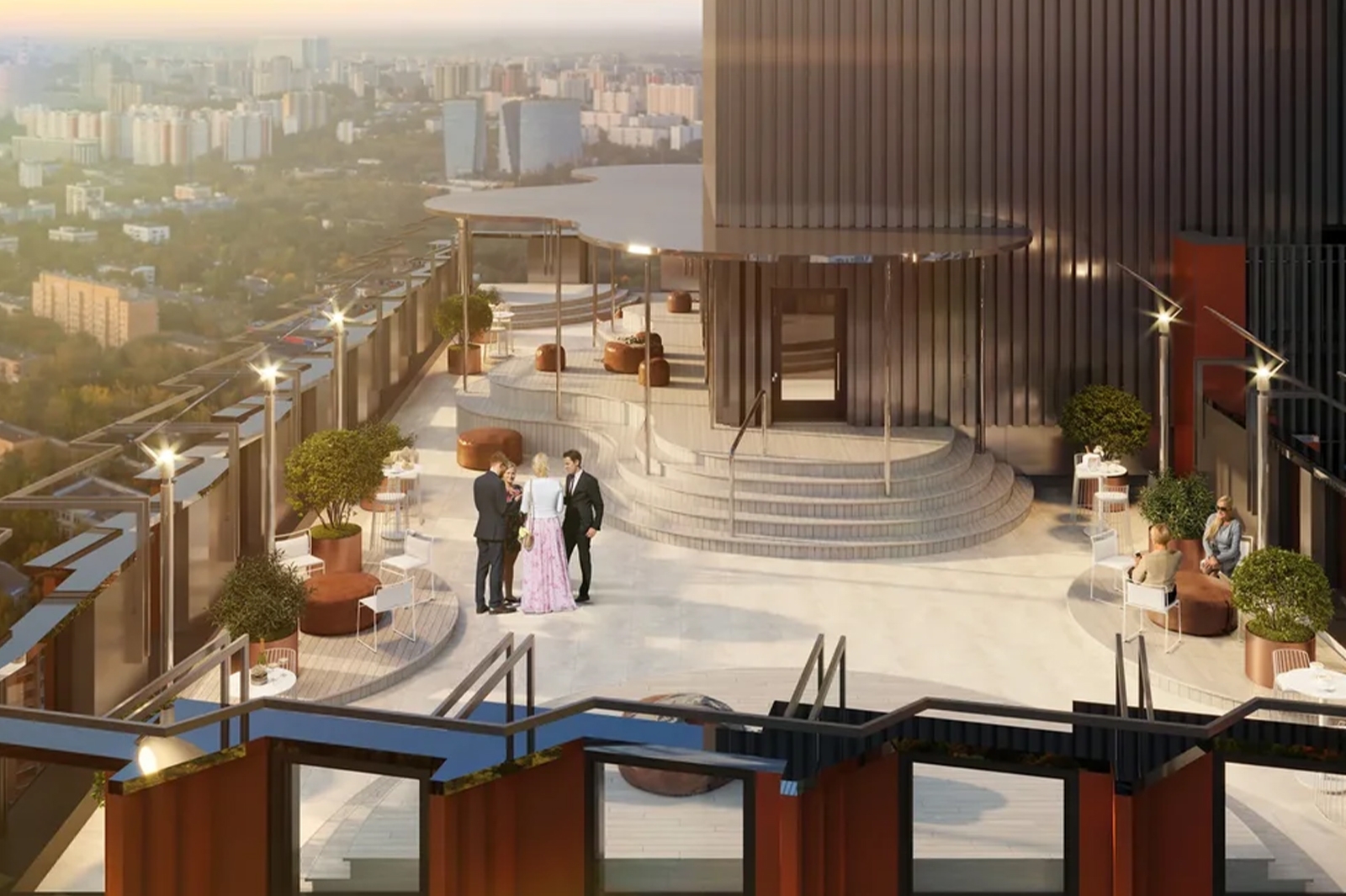 Концепцию общественного пространства разработало архитектурное бюро HAAST. Центральным элементом террасы станет амфитеатр: здесь можно будет встречать рассветы и провожать закаты, любуясь живописными видами. Амфитеатр укроется под металлическим полированным, почти зеркальным навесом. Это еще одно «видовое окно» на город. Террасы с завораживающими видами на МГУ, Воробьёвы горы и парк усадьбы Черёмушки-Знаменское будут доступны всем жителям комплекса и их гостям. Площадь каждой из террас составит почти 280 кв. метров.