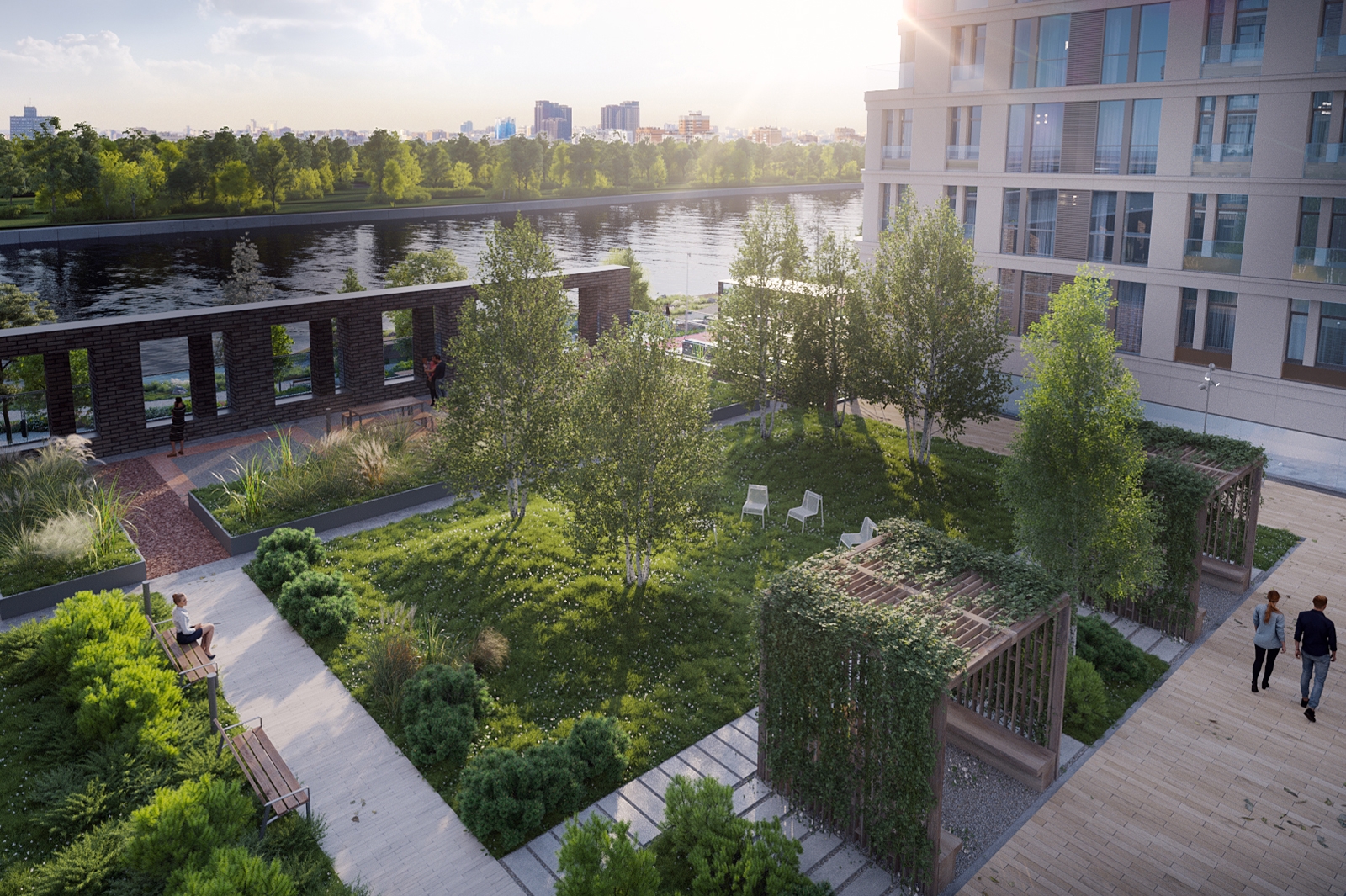 Много внимания уделяется вопросу единства с природой, сохранению и восстановлению природного разнообразия. Ландшафтные дизайнеры воссоздали природную естественность на террасах и во дворе комплекса –выразив этим свое бережное отношение к природе. Для обустройства использовались деревья и кустарники из разных частей света: канадская ирга, барбарис из Северной Америки, японская спирея и близкие нашим просторам бузина, калина и черемуха. Растения, высаженные на стилобате и вокруг комплекса, подобраны по принципу всесезонности и собраны по цветовым гаммам, соответствующим фасадам: красные астранции, гейхера, пурпурный лабазник, дицентра и японский рододендрон. Все это природное богатство объединено в небольшие островки с папоротником, уютными перголами и современной площадкой, разделенной на зоны по интересам и возрастам: для детских игр, прогулок с колясками, отдыха и занятий спортом.
