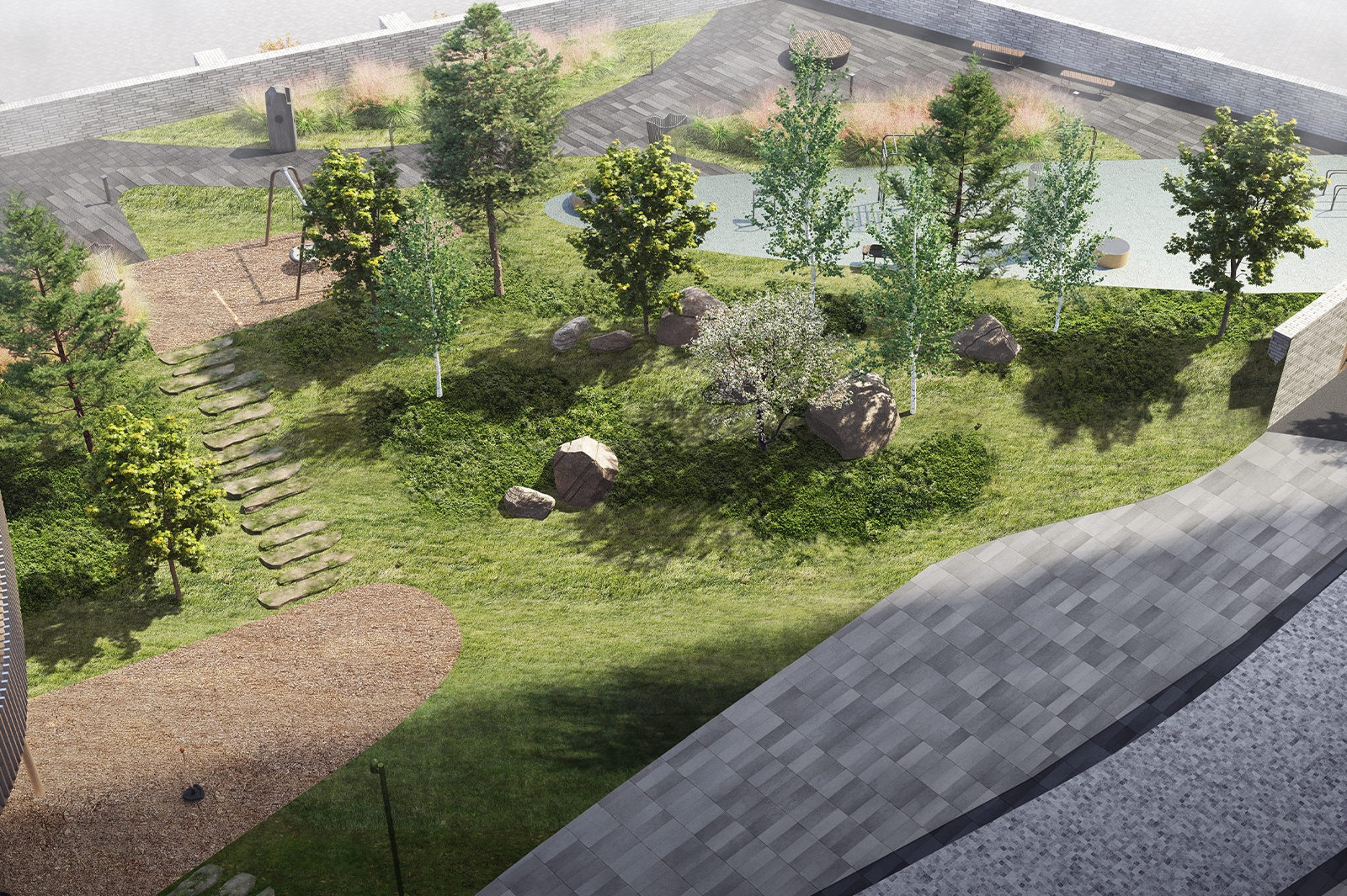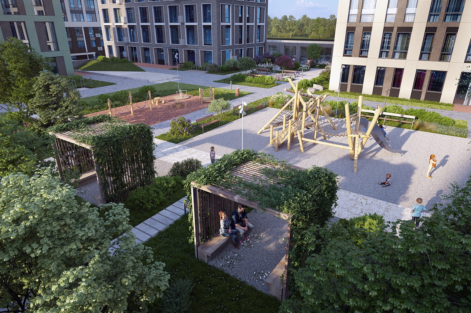 Местные дворы формируют приватные пространства между урбан-блоками. За счет плавного каскадного перехода к набережной образуются привлекательные городские балконы и разноуровневые спуски к ярусам набережной. Во дворах предусмотрены детские и спортивные площадки, прогулочные зоны с элементами ландшафтного дизайна. Детские площадки из натуральных материалов спроектированы с учетом самых различных игровых сценариев. При этом для разных возрастных групп предусмотрены свои зоны для игр и занятий спортом.