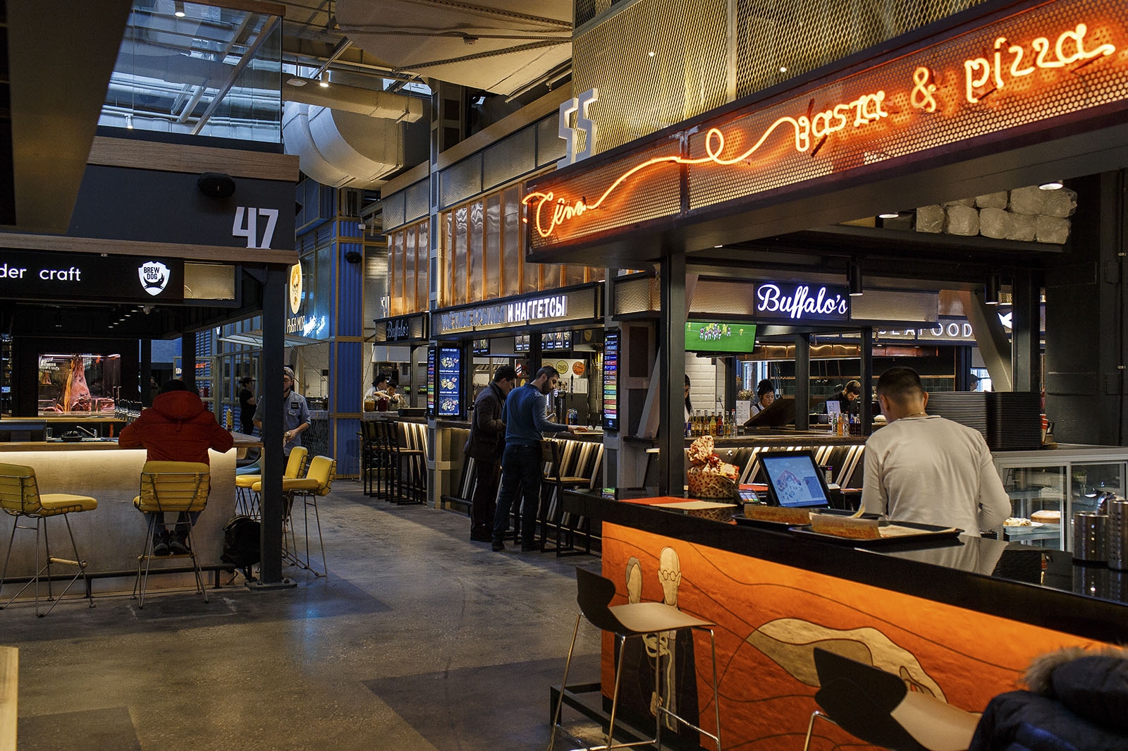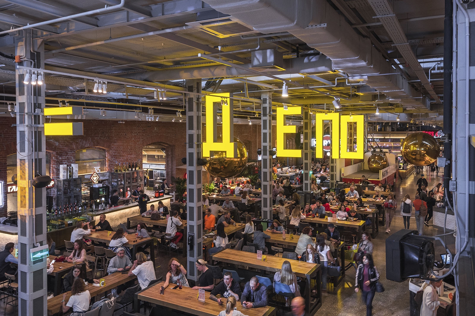 В самом крупном здании расположился фуд-молл «ДЕПО.Москва», который объединяет гастрономические корнеры и лавки со свежими фермерскими продуктами. На территории работает 10 крупных ресторанов.