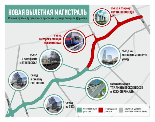 Южный дублер Кутузовского проспекта вместе с улицей Генерала Дорохова и Проектируемым проездом станет новой вылетной магистралью, соединяющей Третье транспортное кольцо и Московскую кольцевую автодорогу. «Вечерняя Москва» первой показывает схему прохождения новой трассы с подъездными путями.