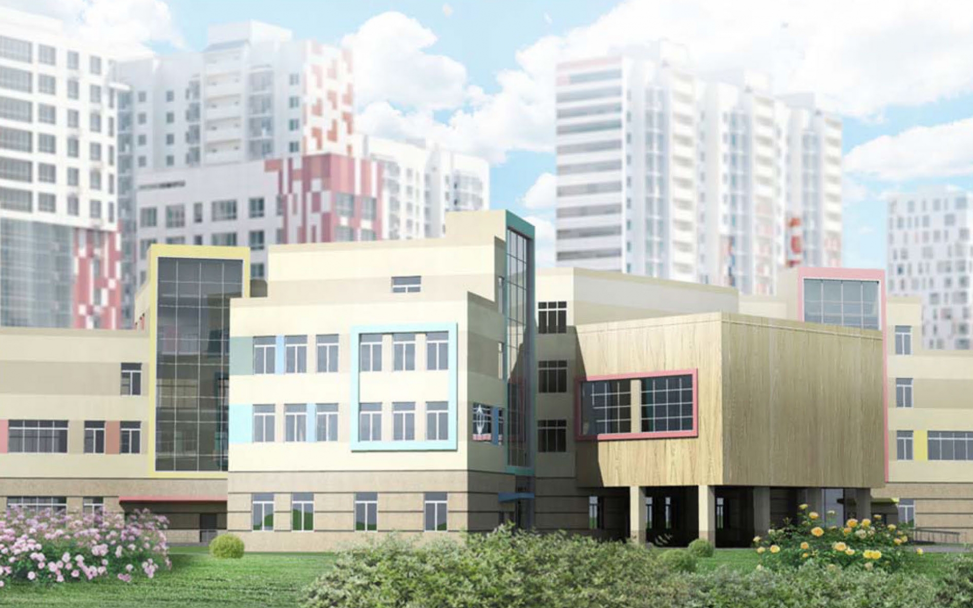 Школьное здание – отдельное, высотой от двух до четырех этажей. Его соединят со спальными корпусами учащихся теплыми переходами.