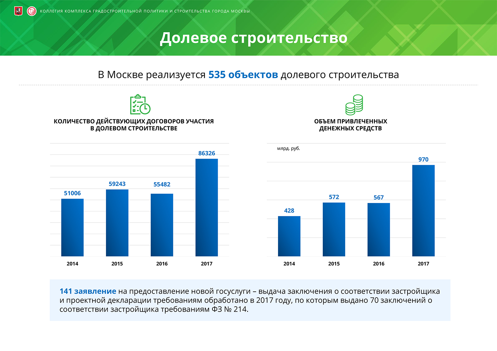 За 7 месяцев 2017 года специалисты Стройкомплекса рассмотрели 3651 проектную документацию. Экономия бюджетных средств по итогам экспертизы проектов составила 16% от общей стоимости объектов. Так, по результатам экспертизы проектной документации и инженерных изысканий удалось снизить сметную стоимость объектов городского заказа на 80,98 млрд руб. За тот же период 2015 года снижение сметной стоимости составило 56,89 млрд руб. при общей сметной стоимости объектов в 353,81 млрд руб.