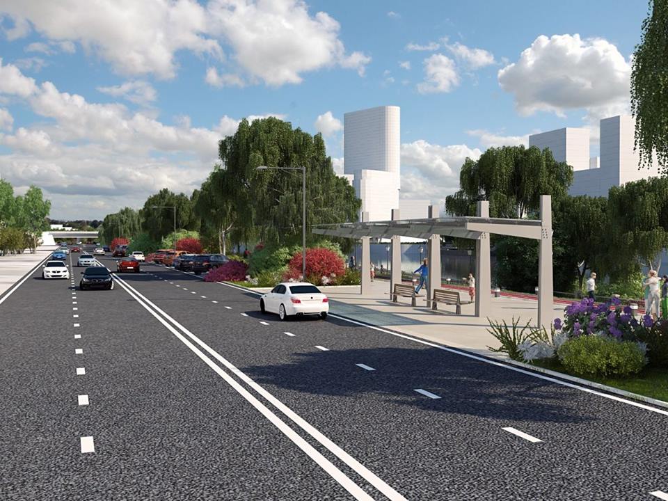 «Входы в парк будут совпадать с планировкой и застройкой прилегающих жилых кварталов, переходов и расположением остановок. На проезжей части будет четыре — шесть полос движения, крайние правые — для общественного транспорта», — рассказал архитектор.