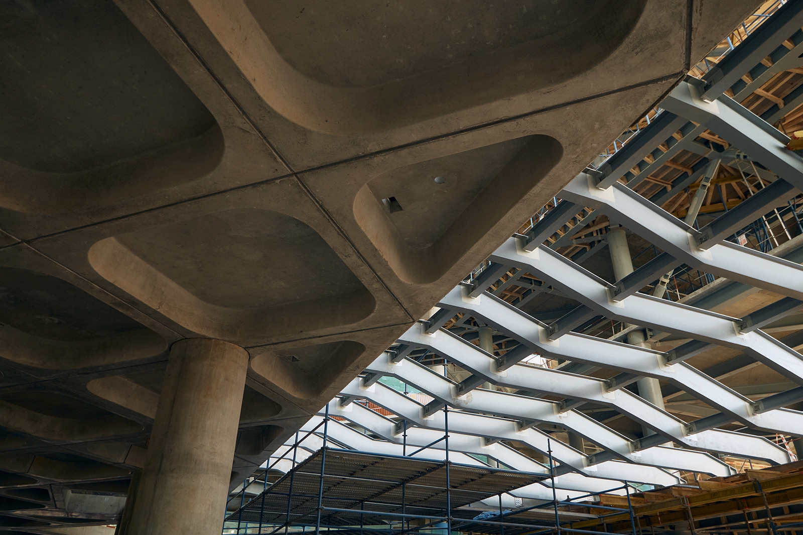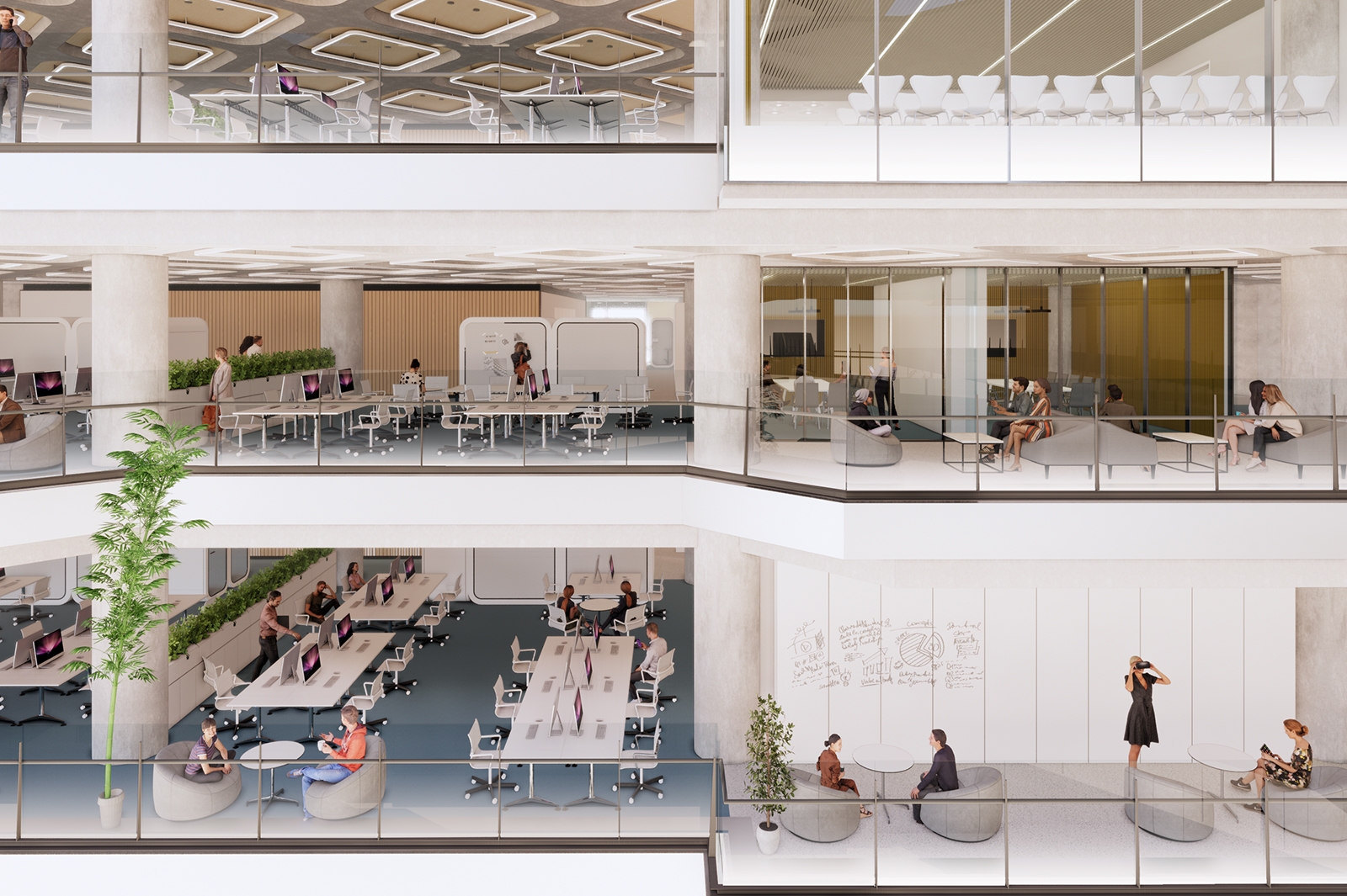 Визуально объект будет представлять собой три крыла, объединенных центральным атриумом. Помимо 15 наземных этажей с офисами и общественными пространствами, предусмотрено пять подземных уровней с паркингом, спорткомплексом и бассейном. Фасады здания будут иметь панорамное остекление, их облицуют металлическими панелями.