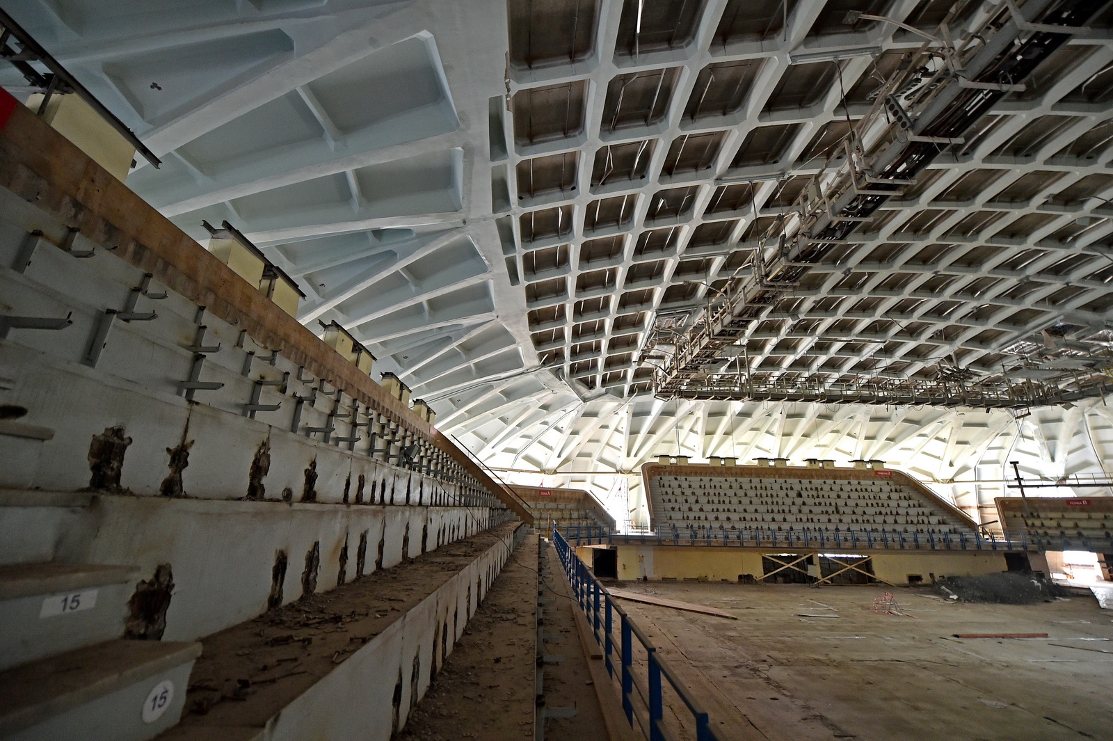 Сносить трибуны в большом зале не планируется. Здесь появятся новые кресла и уникальная система-трансформер. В сжатые сроки можно будет задвигать или выдвигать нижний ряд трибун, тем самым увеличивая или уменьшая площадь зала для проведения различных мероприятий. Раньше это делали вручную, теперь достаточно будет нажать на кнопку. Подобная система есть на ледовой арене «Динамо».