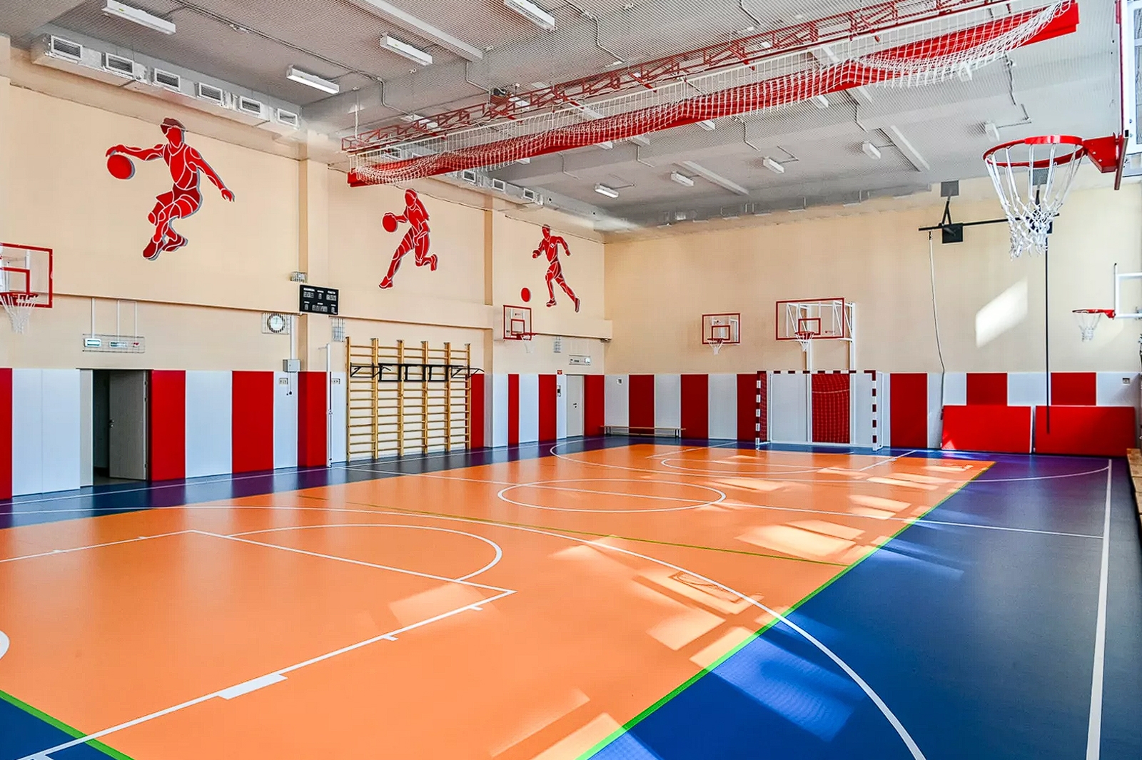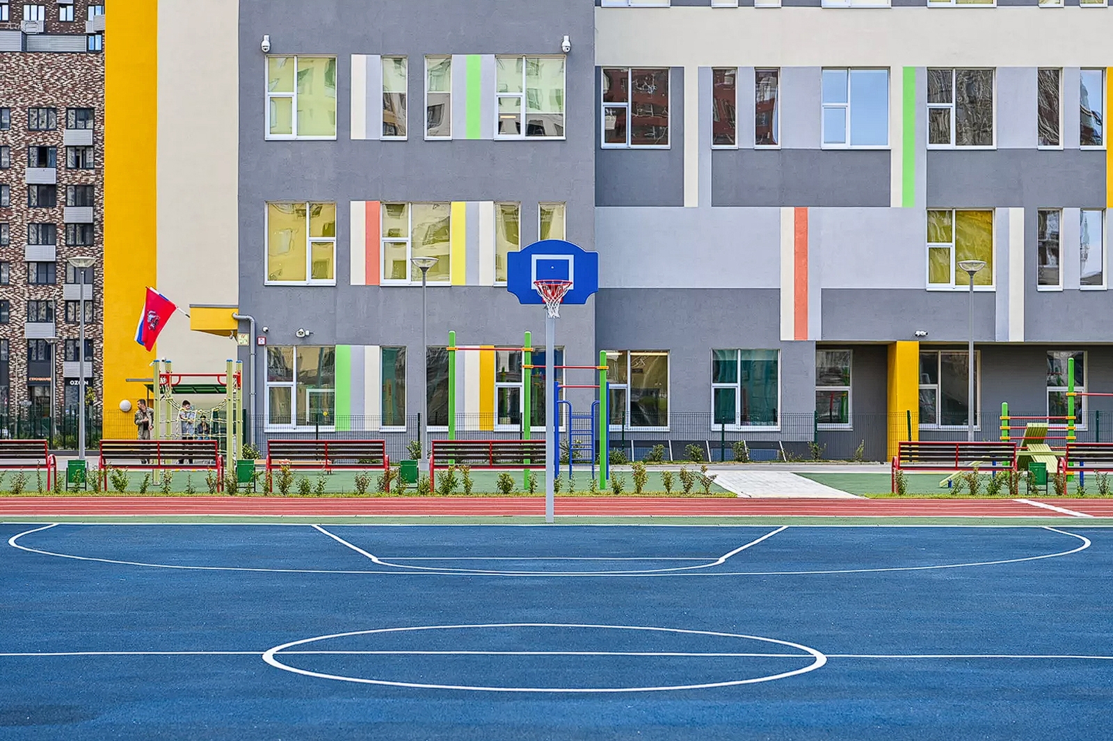 Спортивное ядро школьного двора включает площадки для гимнастики, волейбола, баскетбола, мини-футбола, круговую беговую дорожку, зону для прыжков в длину с разбега. Также обустроят пространство для торжественных мероприятий и зону садоводства.
