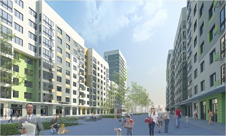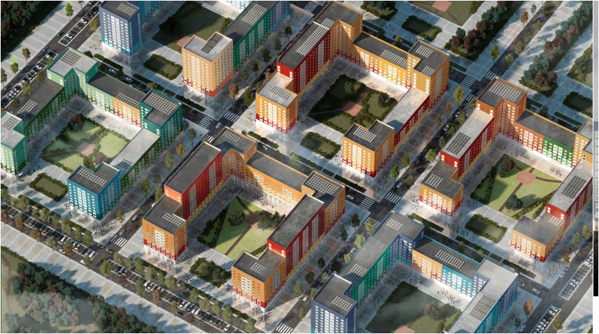 Из представленных секций формируются три современных типа квартала размерами от 80 до 100 метров. Первый сформирован башнями, второй имеет внутреннюю площадь и третий - незамкнутый квартал, демонстрирующий возможности поворотных и угловых секций. Все первые этажи вдоль улиц сделаны общественными. Внутри двора обеспечен единый уровень, чтобы исключить препятствия маломобильным жителям.