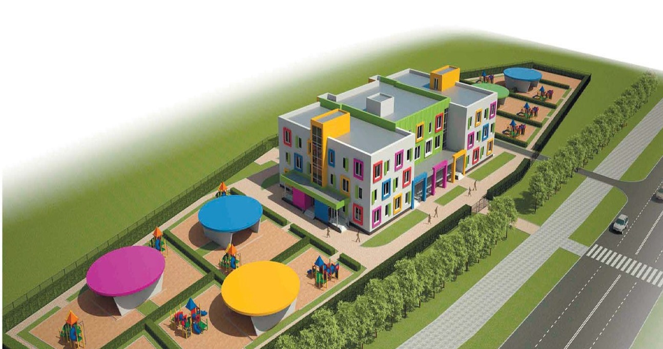 Детский садик в микрорайоне Щербинка, по адресу ул. Маршала Савицкого, напротив вл. 16-18 спроектирован бюро «Столичный стиль» и представляет собой простую симметричную композицию из трех прямоугольных блоков с выделенной входной группой. Основным архитектурным приемом здесь выступают цветные акценты - оконных переплетов, входных групп, лестничных узлов. Цветом также выделен центральный объем и круглые навесы над игровыми площадками.