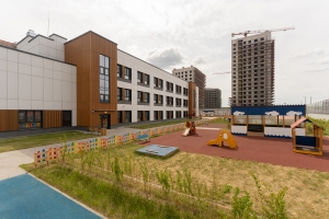 Во дворе размещаются оборудованные детская и спортивная площадки, а также площадки для отдыха. На придомовой территории высаживаются деревья, кустарники и газоны.