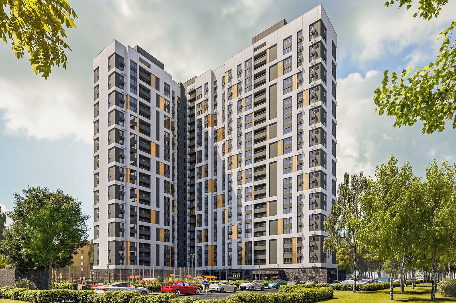 При внешней отделке здания применяется система вентилируемого фасада с использованием фиброцементных панелей. На фасадах устанавливаются корзины для кондиционеров. Входные группы оформлены витражным остеклением.