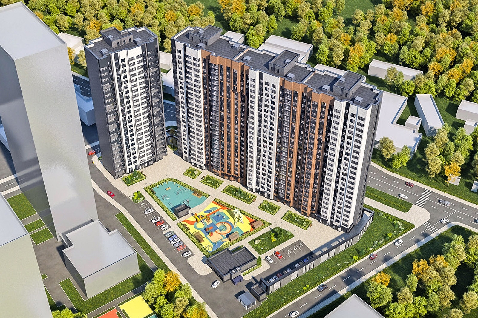 При внешней отделке зданий применяется система вентилируемого фасада с использованием бетонной плитки "под кирпич". На фасадах устанавливаются корзины для кондиционеров. Входные группы оформлены витражным остеклением.