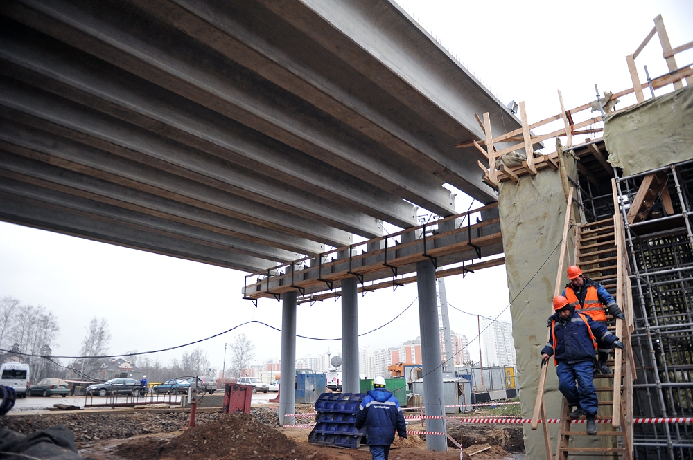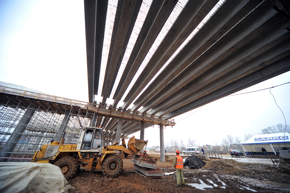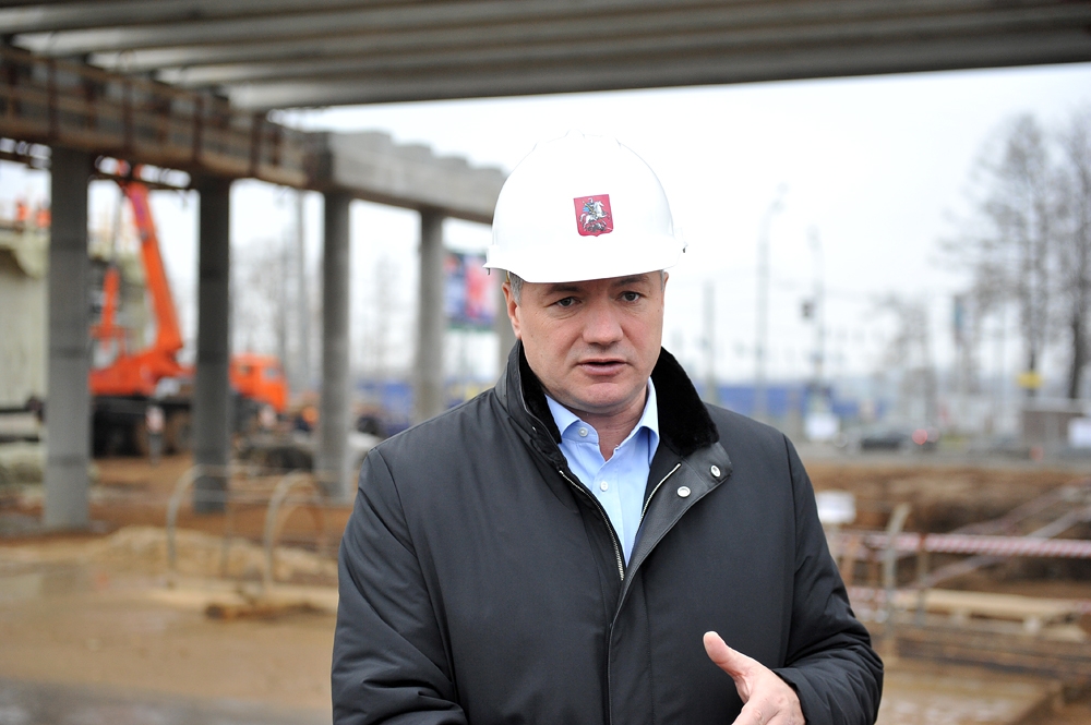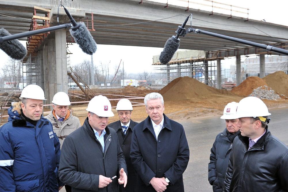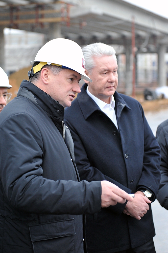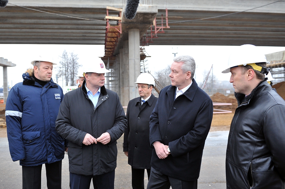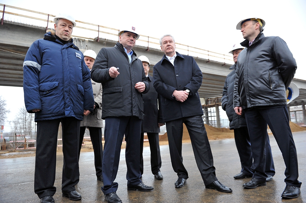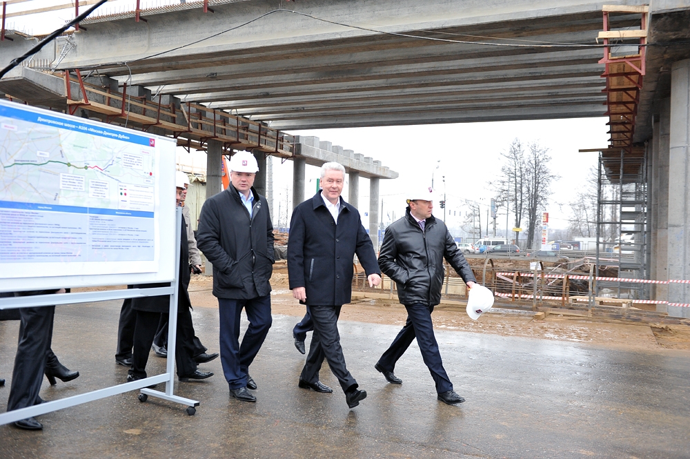 Осмотр хода строительства эстакады на пересечении Дмитровского шоссе с Долгопрудненским и Челобитьевским шоссе. С. Собянин, М. Хуснуллин, А. Бочкарев