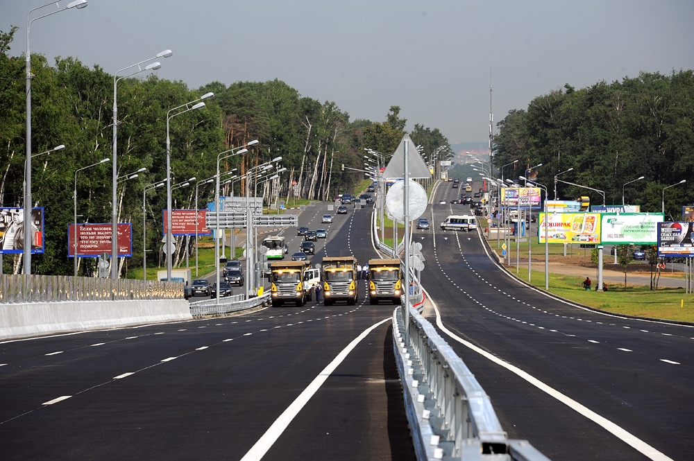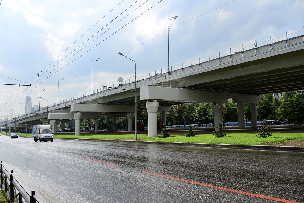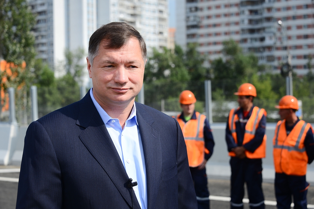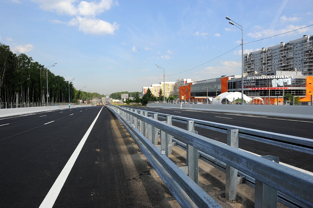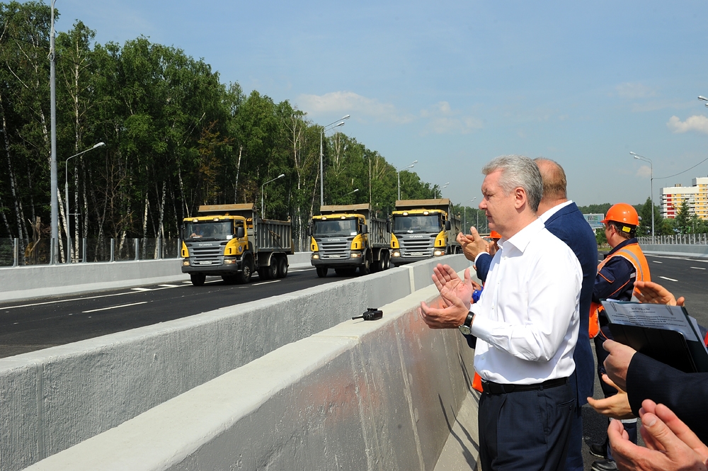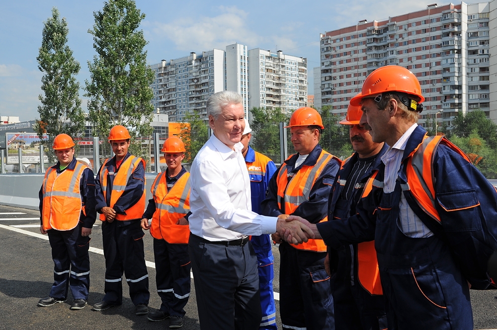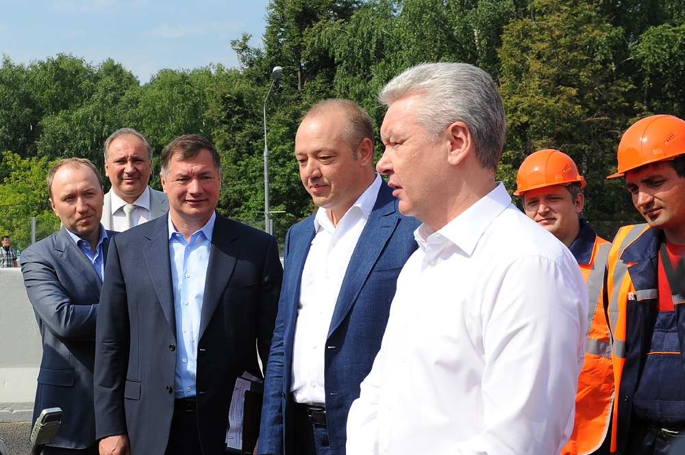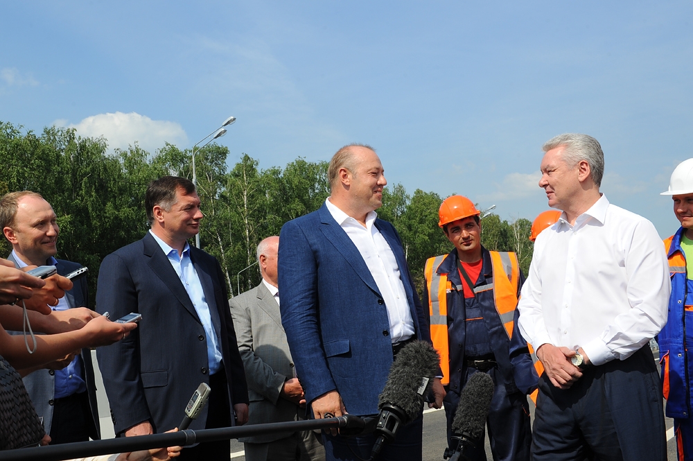 Открытие эстакады на пересечении Рублевского шоссе с улицами Маршала Тимошенко, Академика Павлова и Осенним бульваром. С. Собянин, М. Хуснуллин. А. Бочкарев