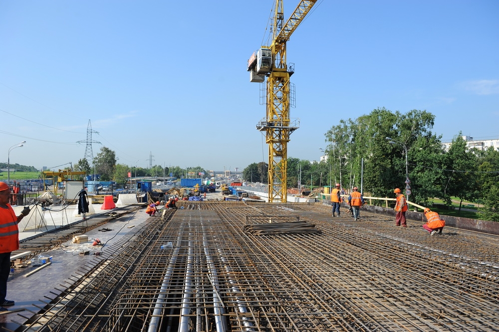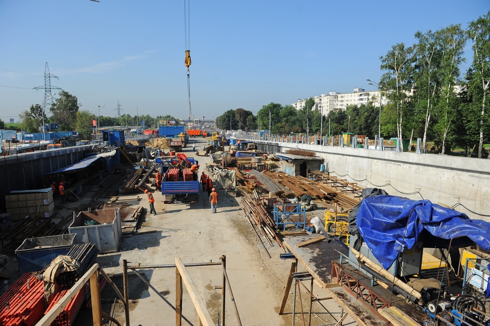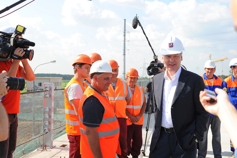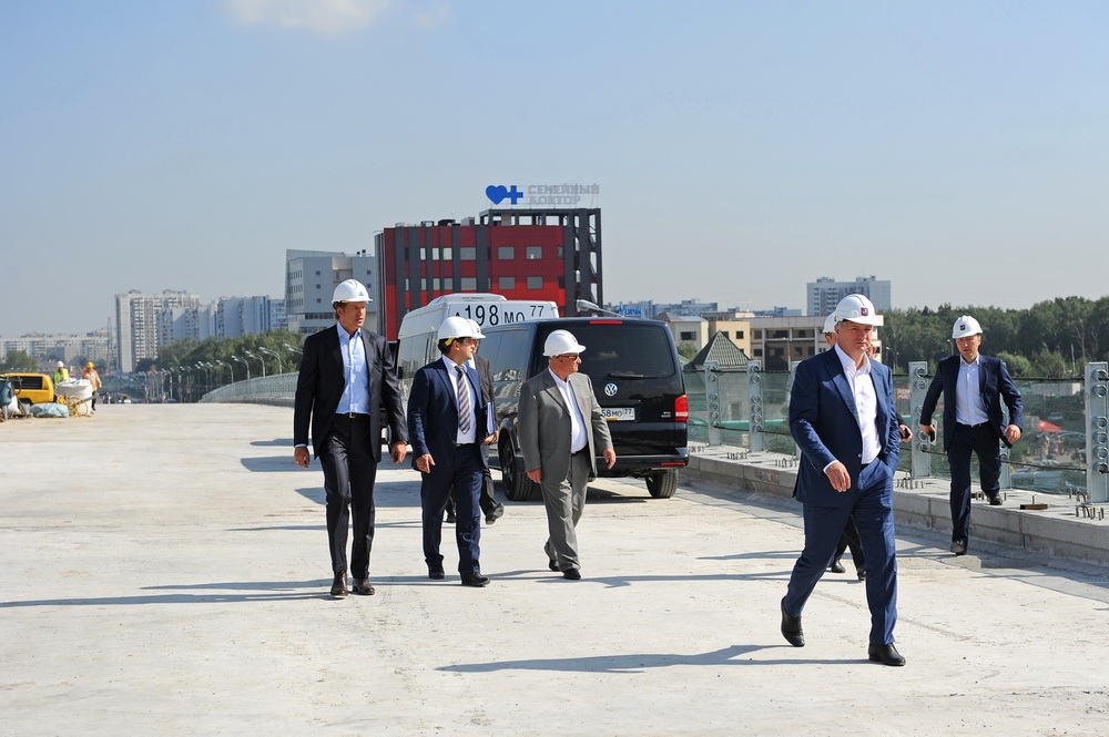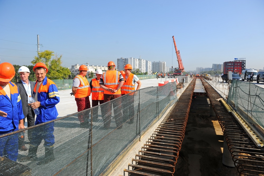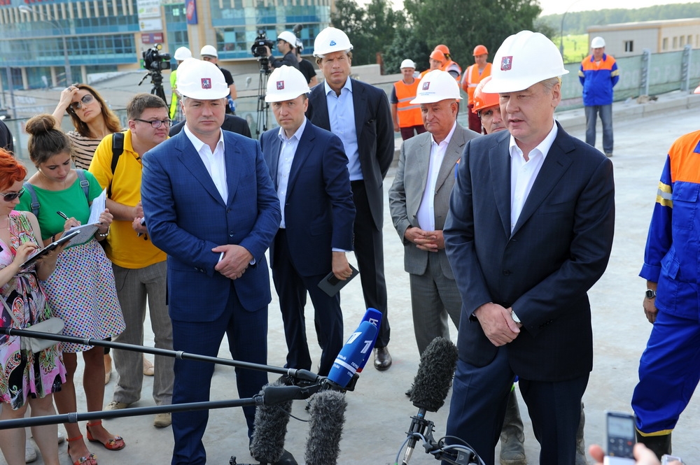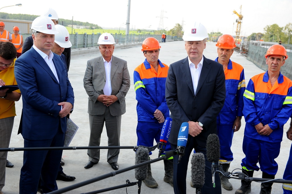 Осмотр строительства транспортной развязки на пересечении Новоясеневского проспекта и Профсоюзной улицы. С. Собянин, М. Хуснуллин, А. Бочкарев