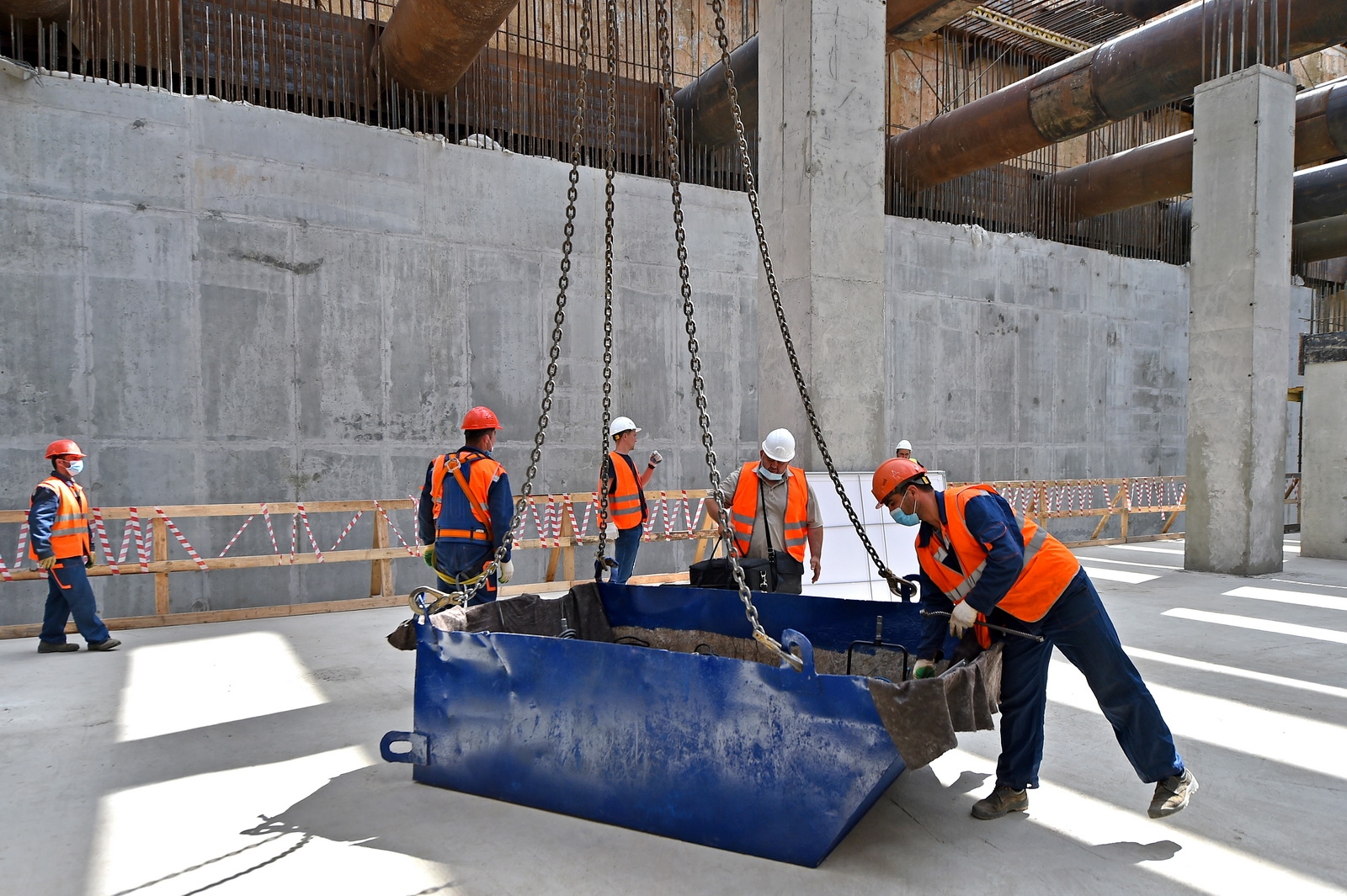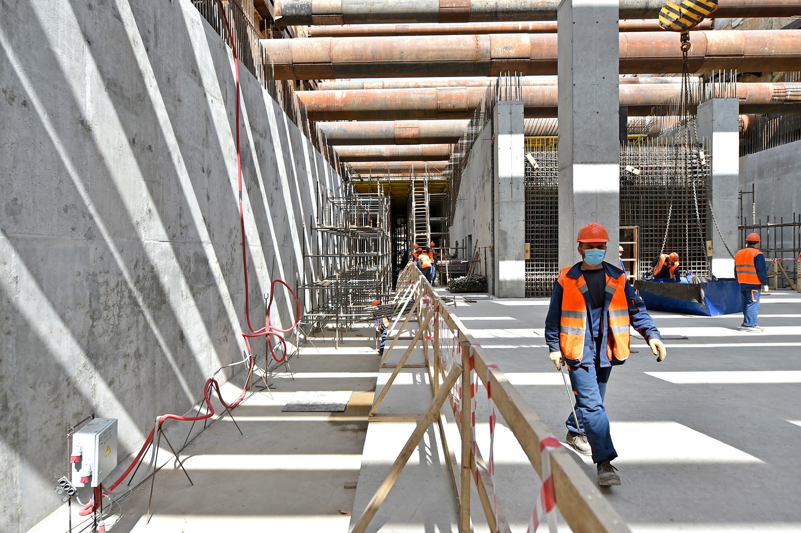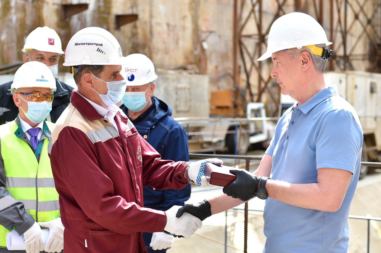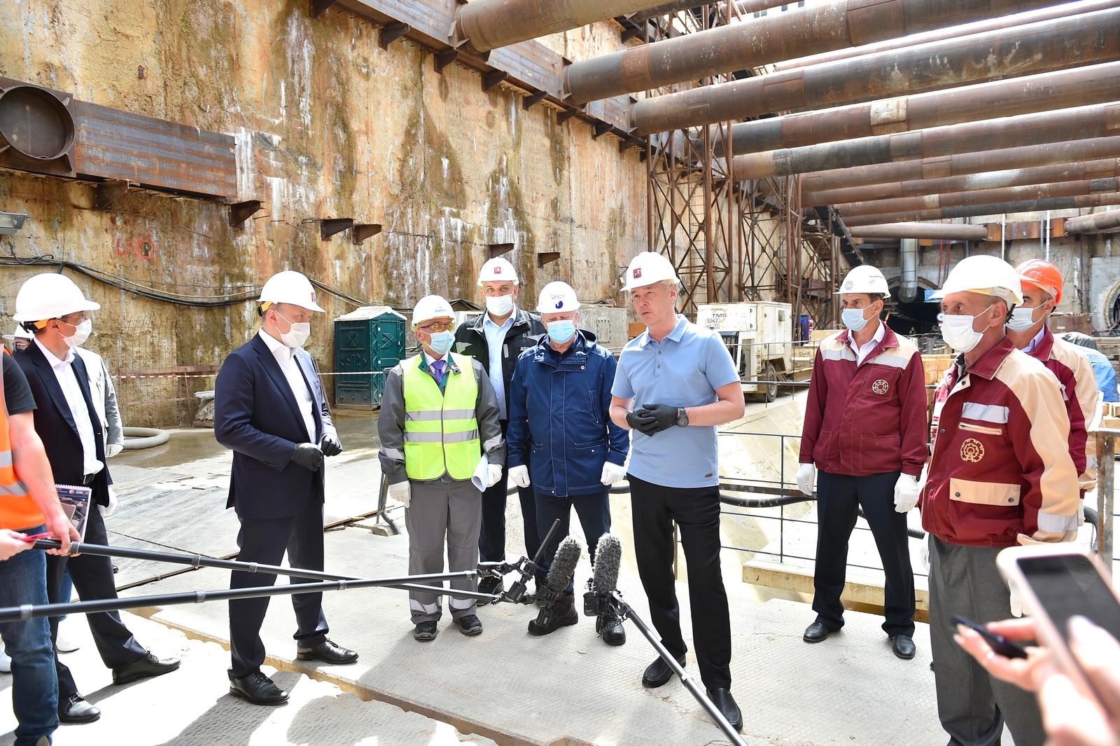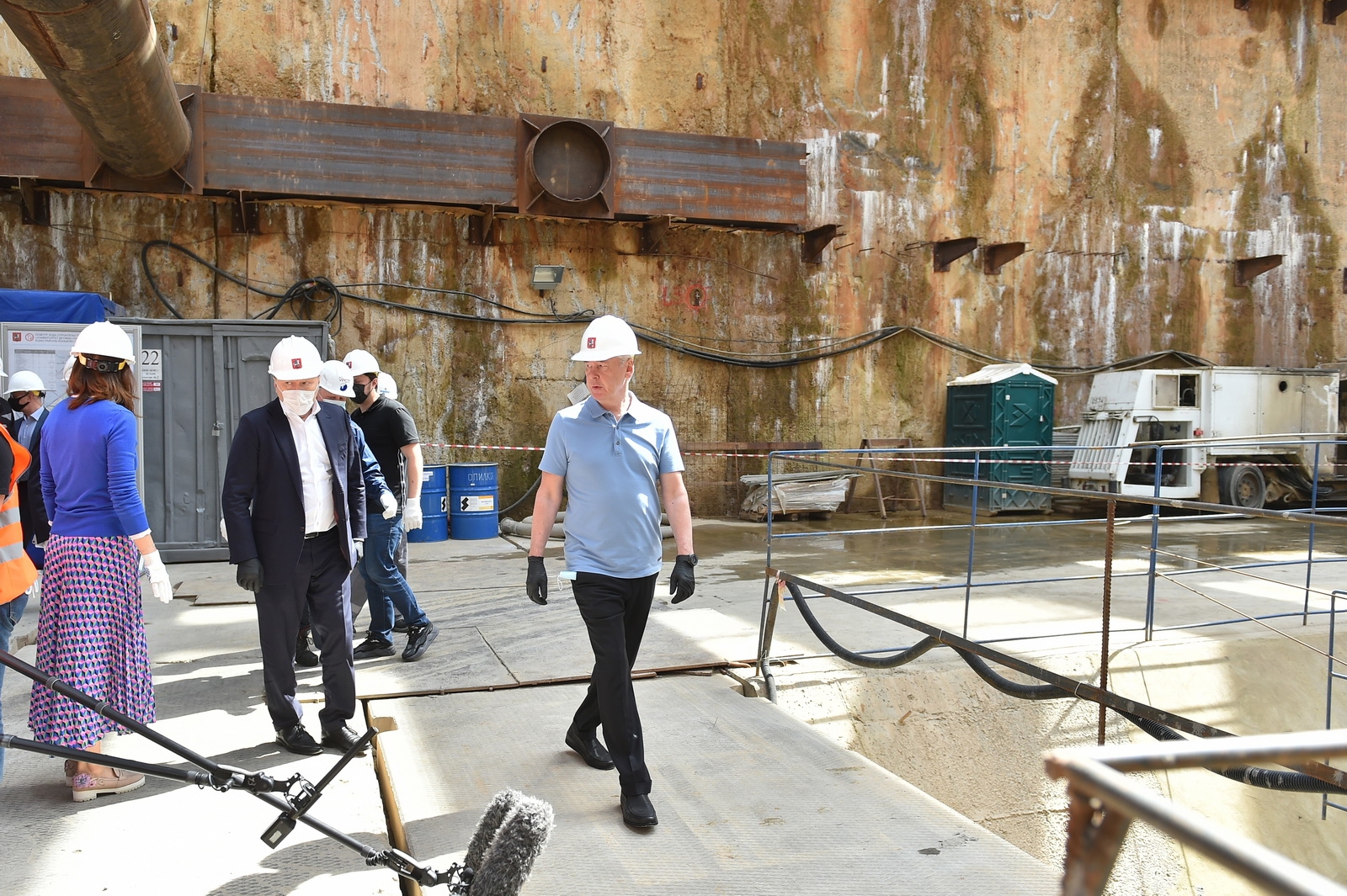 Осмотр хода строительства станции метро «Университет Дружбы Народов» Коммунарской линии. С. Собянин, А. Бочкарев. Фото stroi.mos.ru