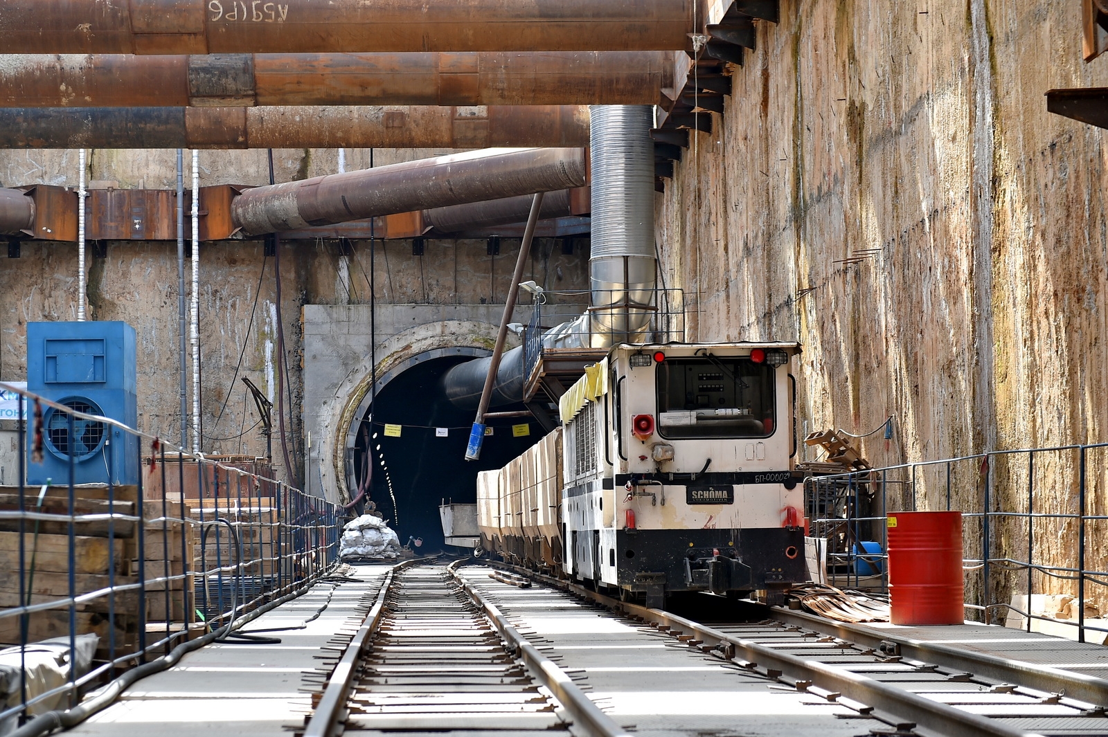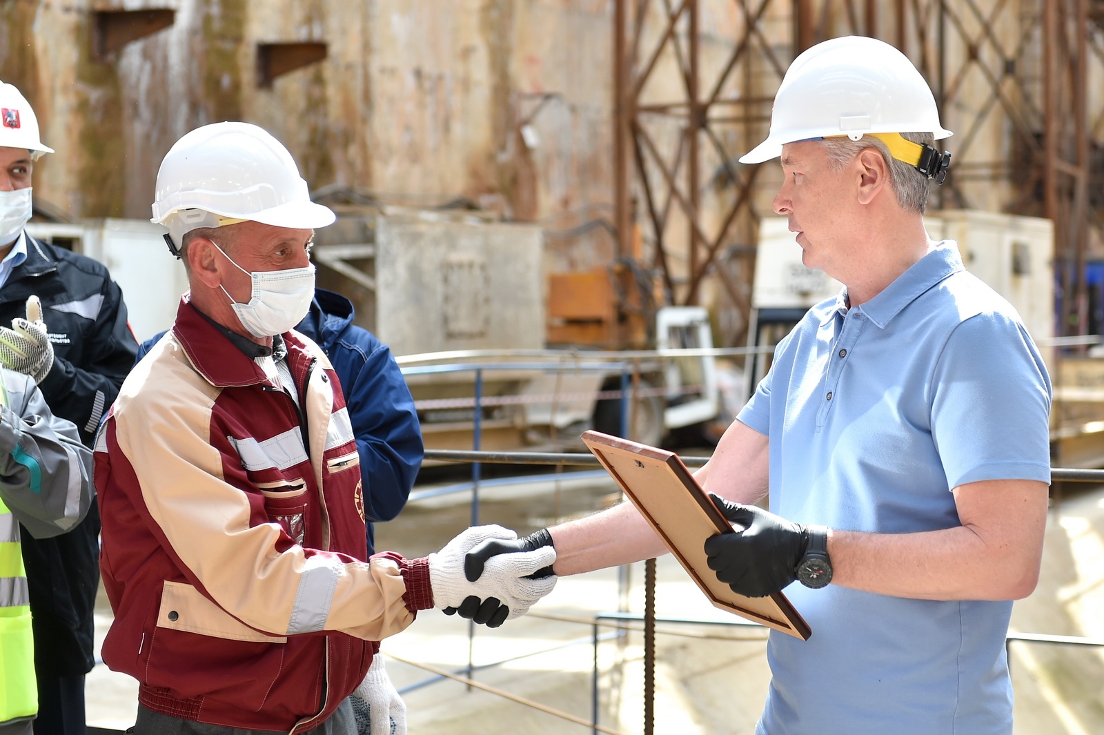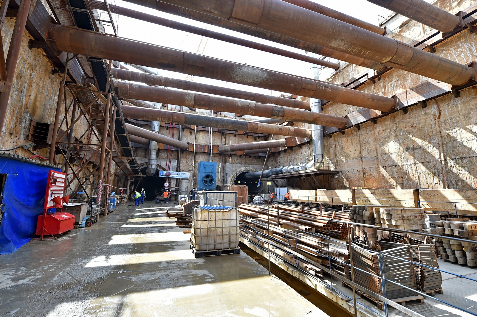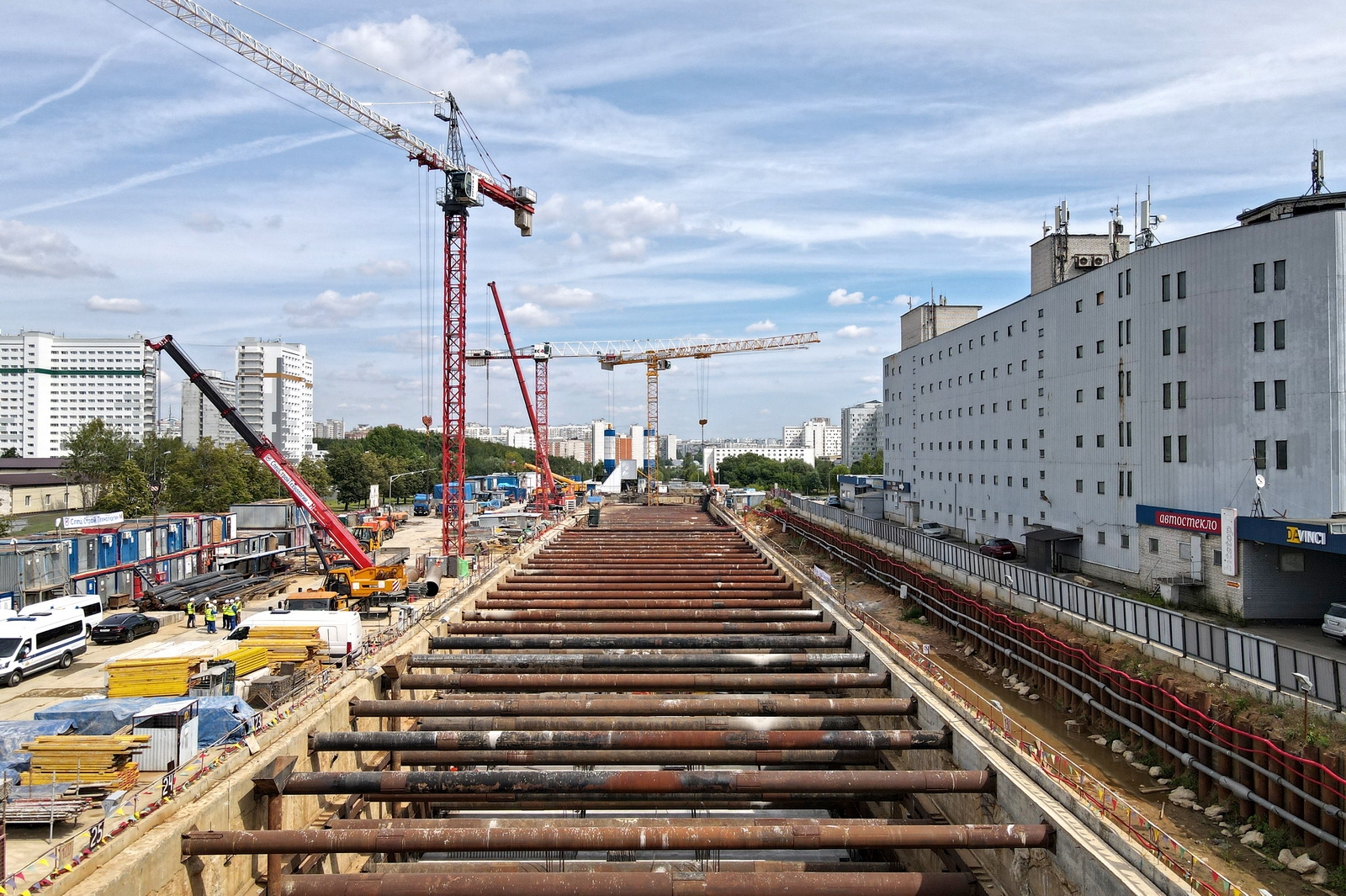 Осмотр хода строительства станции метро «Университет Дружбы Народов» Коммунарской линии. С. Собянин, А. Бочкарев. Фото stroi.mos.ru