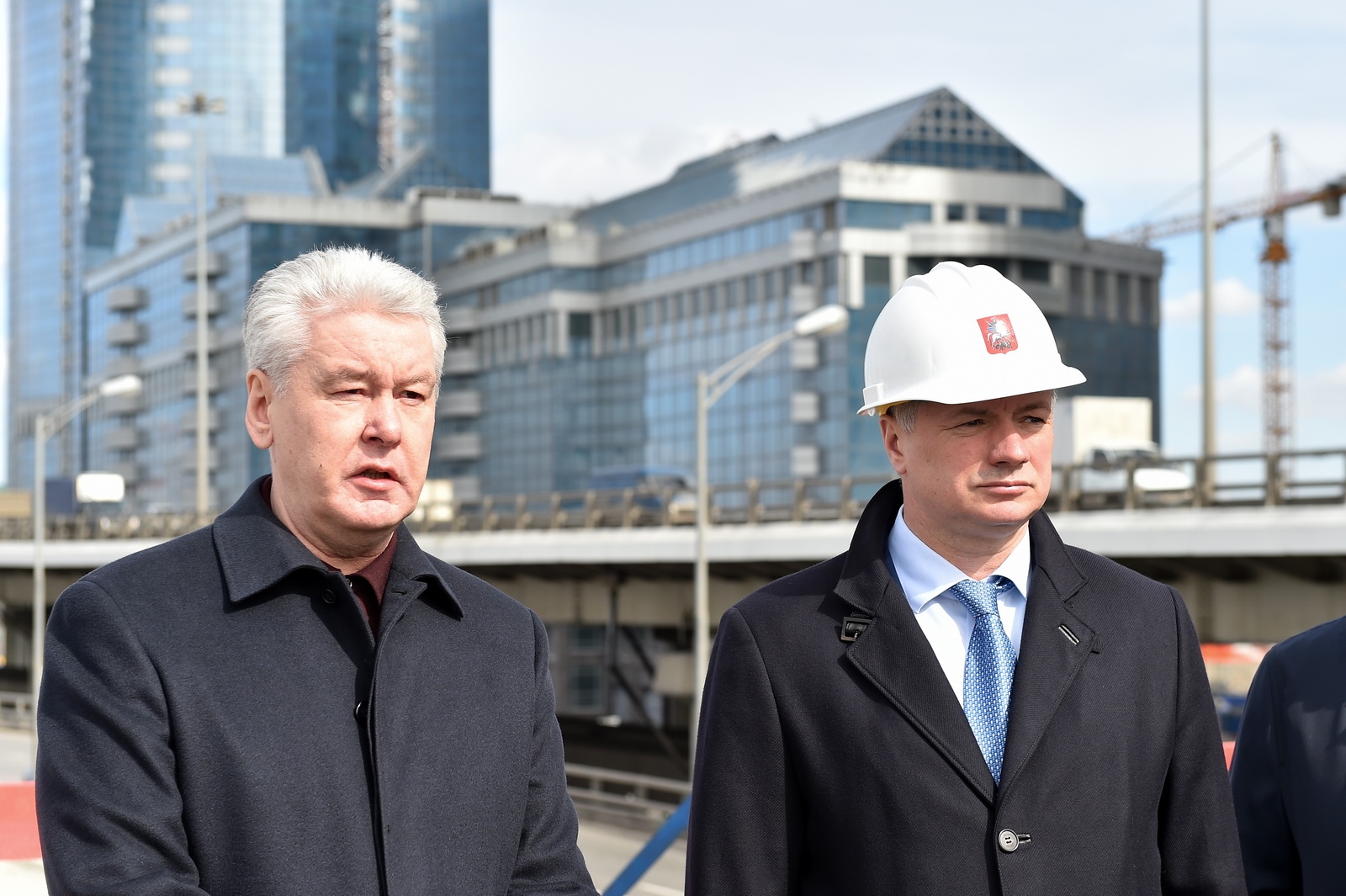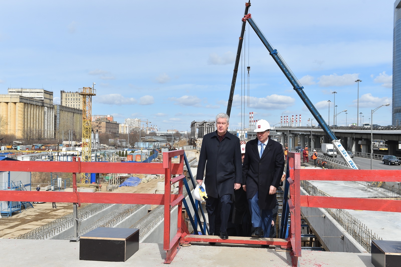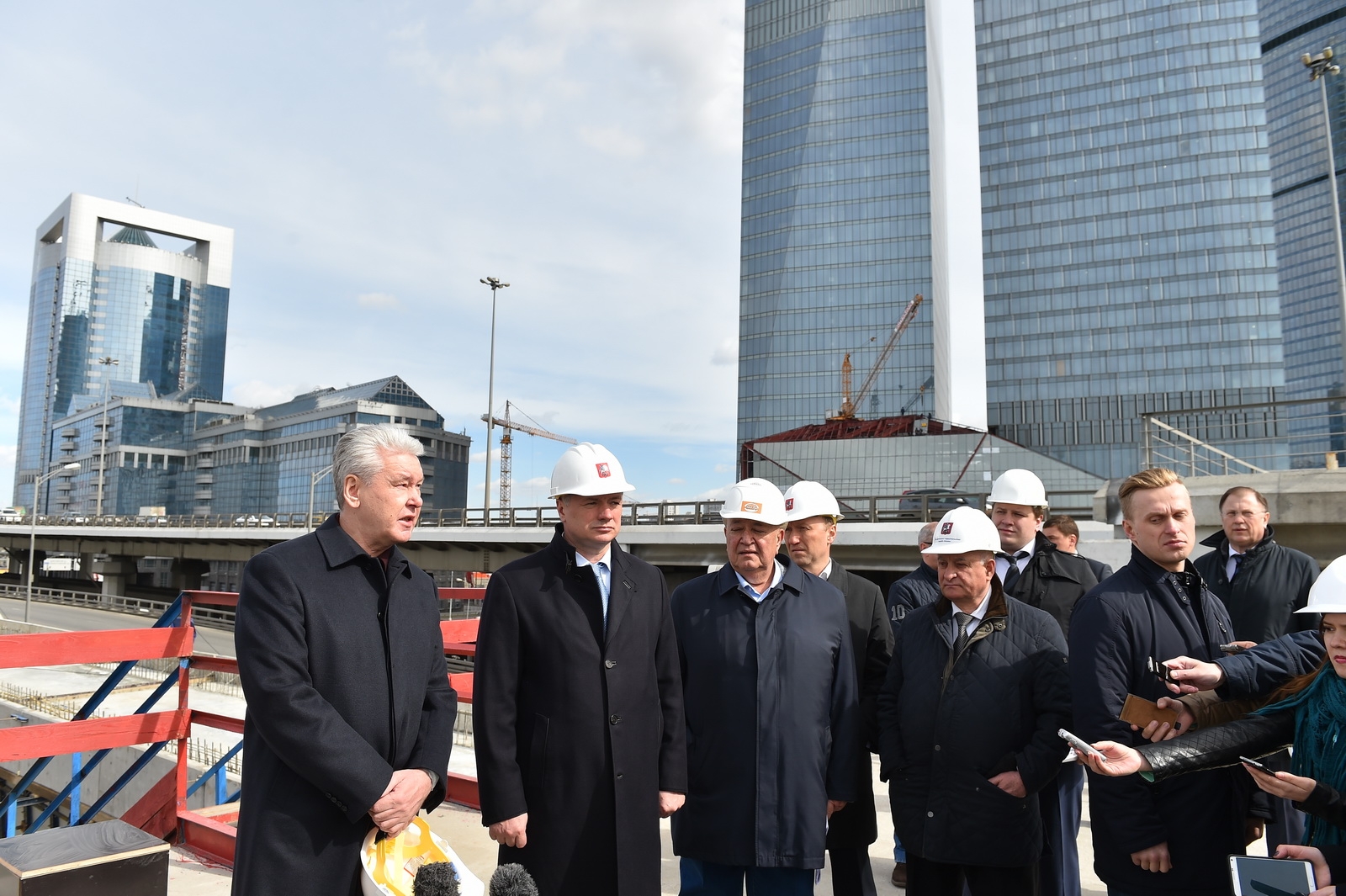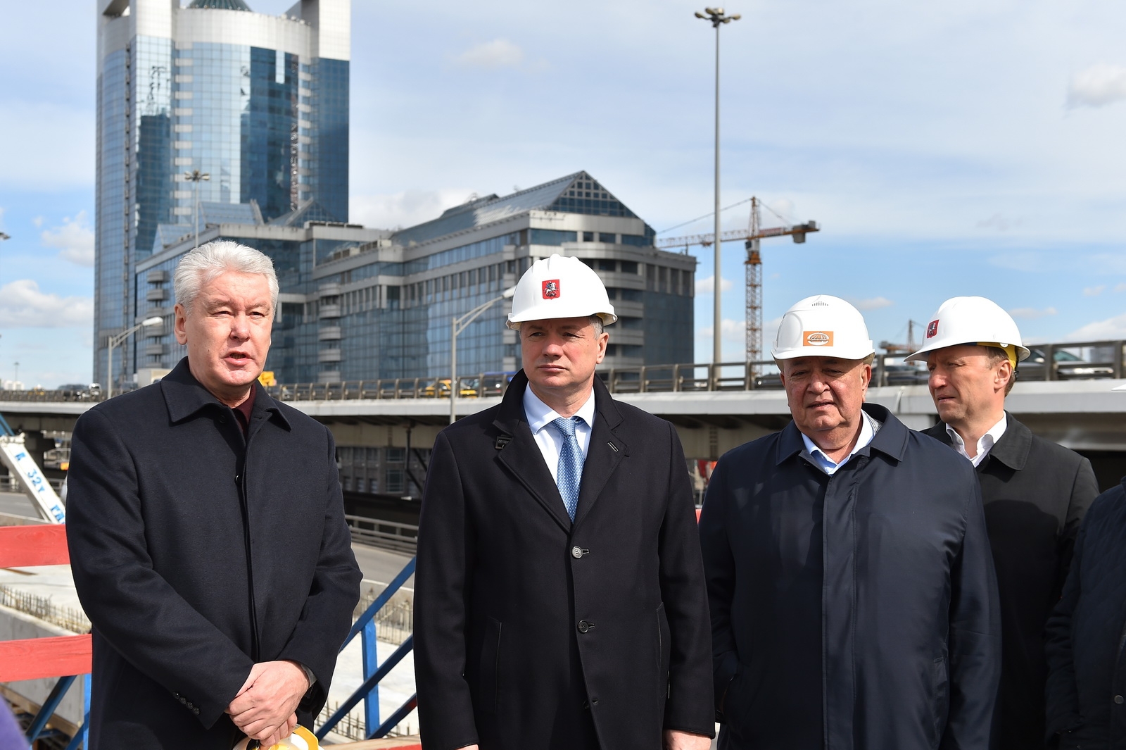 13 апр. 2015 г. Осмотр хода строительства железнодорожной эстакады над Смоленским направлением Московской железной дороги. С. Собянин, М. Хуснуллин
