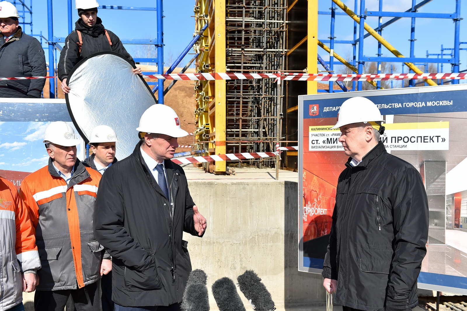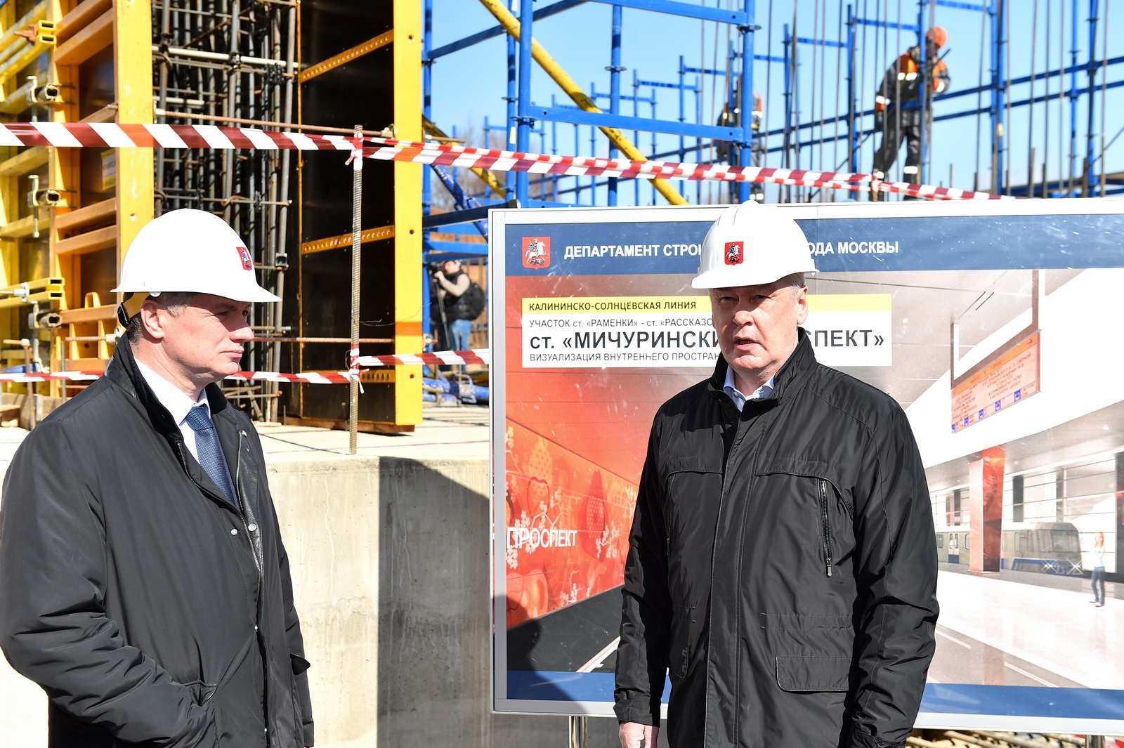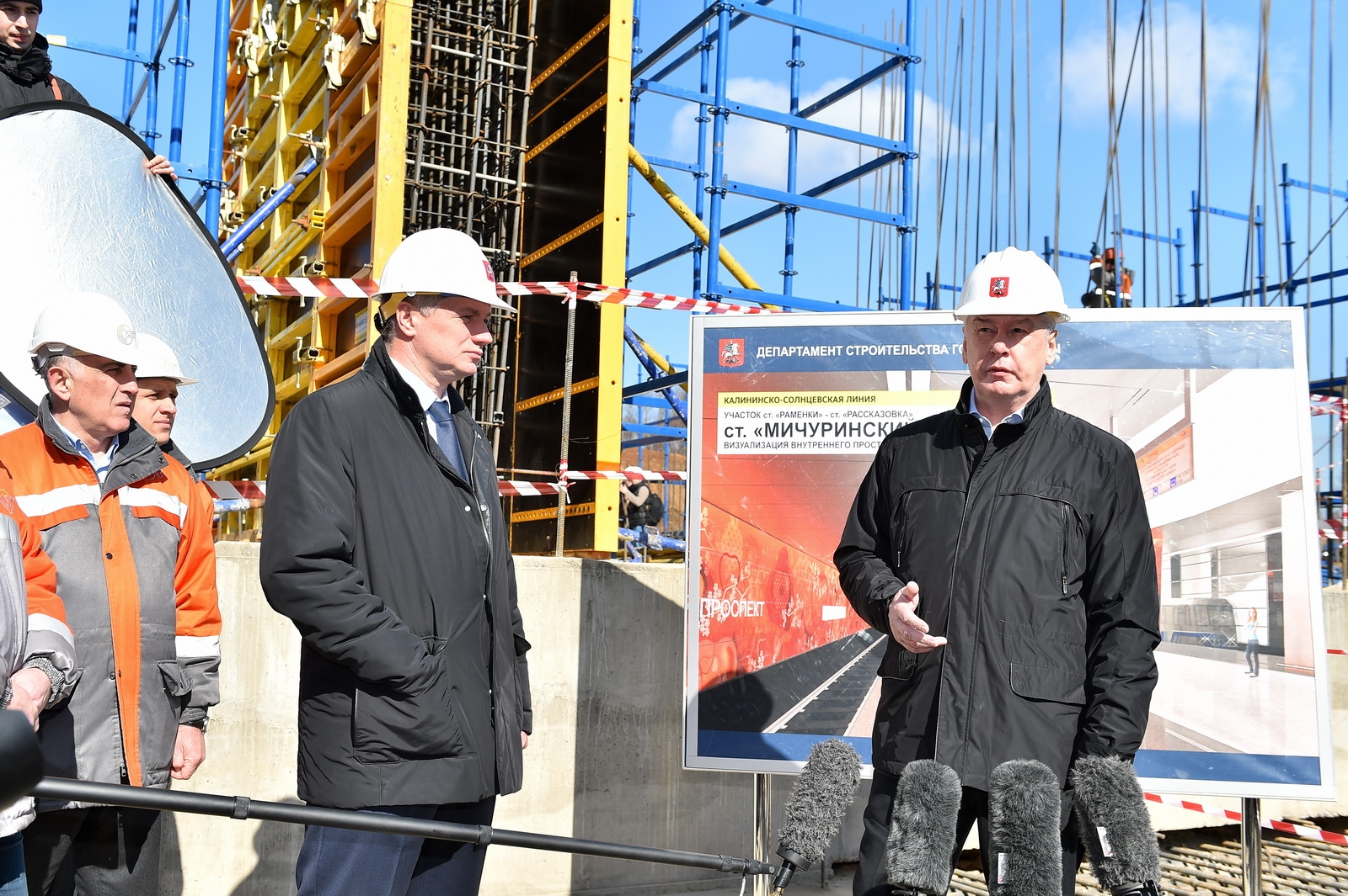 4 апр. 2016 г. Осмотр хода строительства станции «Мичуринский проспект» Калининско-Солнцевской линии метрополитена. С. Собянин, М. Хуснуллин