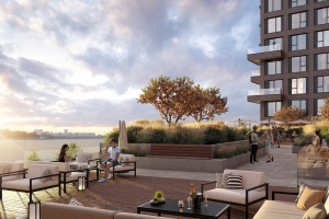 Проект ЖК PORTLEND с лаунж-зоной на крыше стилобата, понтонным бассейном и набережной. Рендеры Москомархитектуры