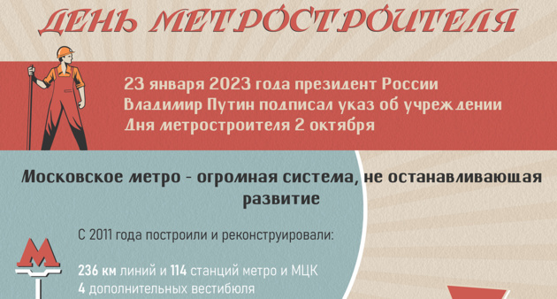 2 октября 2023 года в России впервые отмечается профессиональный праздник метростроителей. О том, как развивается система московского метро и о традициях метростроителей – в новой инфографике.