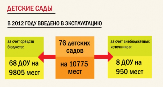 В 2012 году введено в эксплуатацию 76 детских садов на 10 775 мест, в т.ч.: 68 ДОУ на 9805 мест - за счет средств бюджета; 8 ДОУ на 950 мест - за счет внебюджетных источников. В результате очередь в детские сады на территории «старой» Москвы для детей от трех до семи лет ликвидирована.
