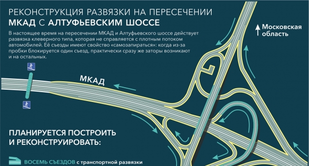 На пересечении МКАД и Алтуфьевского шоссе действует развязка клеверного типа, которая не справляется с плотным потоком автомобилей. Её съезды имеют свойство «самозапираться»: когда из-за пробки блокируется один съезд, практически сразу же заторы возникают и на остальных.