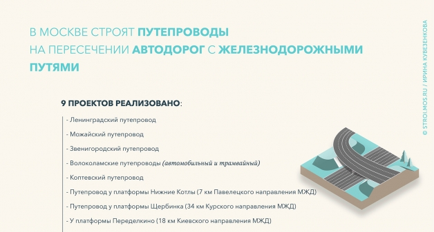 С 2011 года в Москве построено и реконструировано 19 путепроводов, еще 10 планируется построить до конца 2027 года.