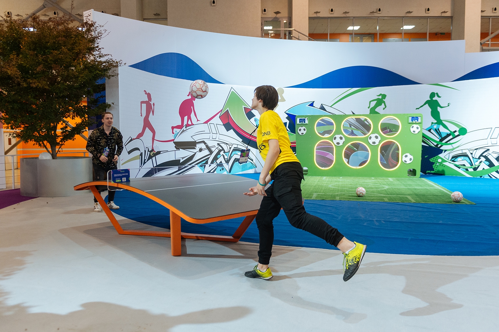 Игра напоминает настольный теннис. Но есть важные отличия. Используется искривленный стол и мяч, похожий на футбольный, ударять по которому можно любой частью тела, кроме рук. Это командная игра, но формат «один на один» не менее увлекателен. Кстати, текбол впервые представили на выставке «Город: детали».