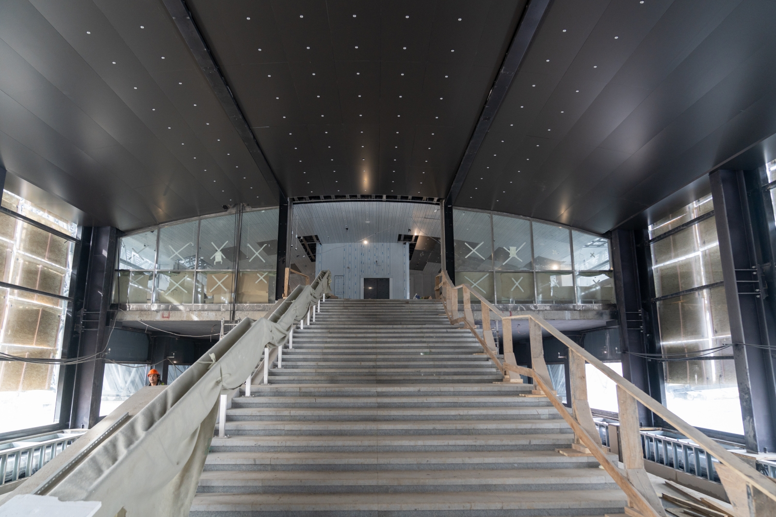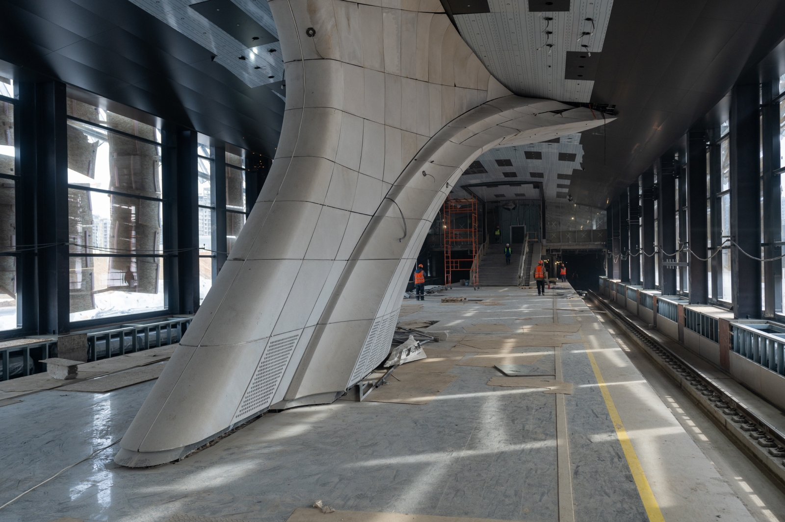 Ильдар Гиниятов, руководитель архитектурного бюро PARSEC: Главное – это, безусловно, две колонны станции. Даже сейчас, в незаконченном виде, они выглядят впечатляюще, создается ощущение, что находишься не на станции, а в музее. Посередине пассажирской зоны расположена скульптурная колонна авторства художника Даши Намдакова. Снаружи находится вторая колонна – очень необычная опорная структура, поддерживающая масштабный вылет козырька станции.