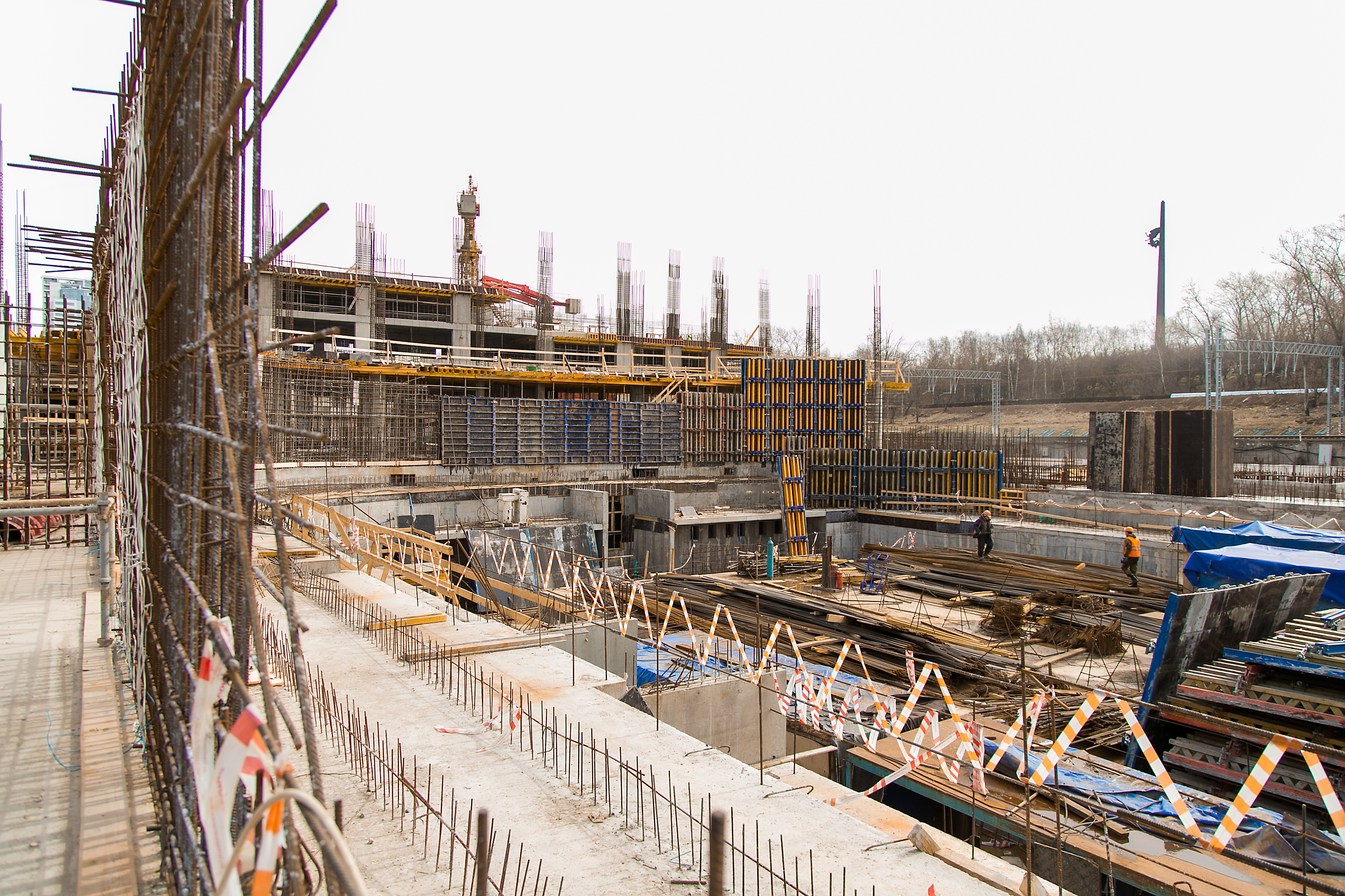 – У нас был длительный начальный этап: работы «нулевого цикла», а это разработка котлована, установка стены в грунте и монолитные работы подземной части, заняли чуть больше года. Необходимо было соблюсти все технологические нюансы, тем более что объемы строительства с учетом трехуровневого паркинга, который занял всю площадь котлована, был колоссальным. В настоящее время идут монолитные работы по возведению седьмого этажа в зоне комплекса апартаментов, в зоне спортивной волейбольной арены возводят второй и трети этажи. В подземном паркинге, который рассчитан на 1609 машино-мест, начали укладку инженерных коммуникаций. Если обобщить, то монолитные работы выполнены практически на 60%, что полностью соответствует графику.