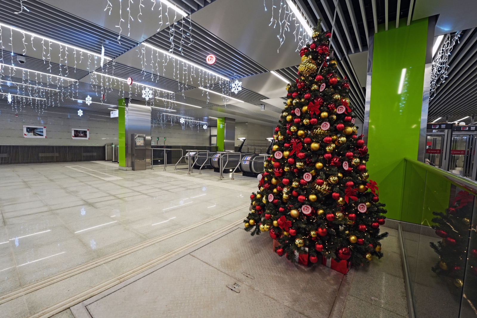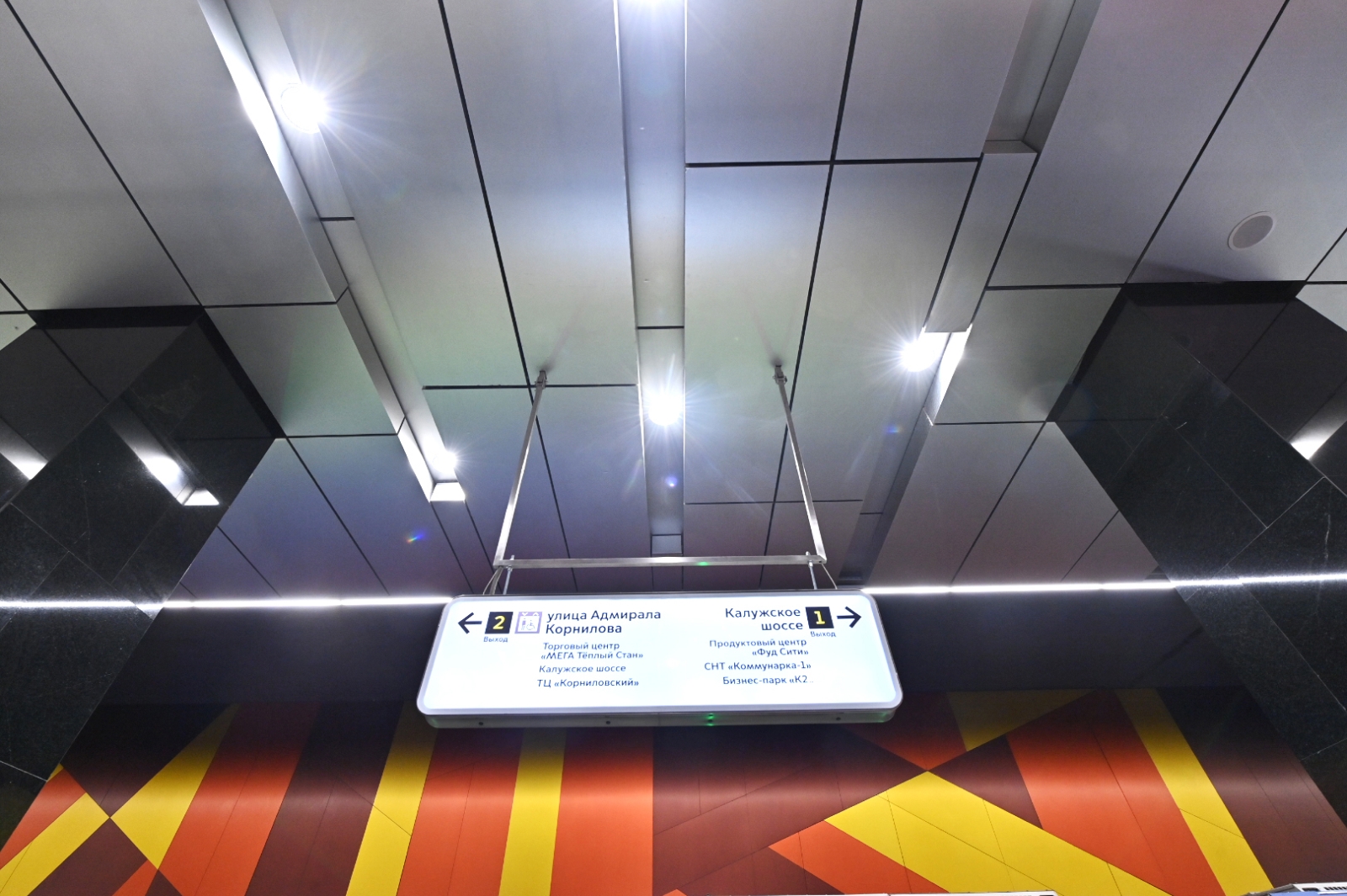 Металлические кольца и цветовые акценты на потолке придают конструкции динамику. Колонны в центре платформы отделаны шлифованными листами из нержавеющей стали.