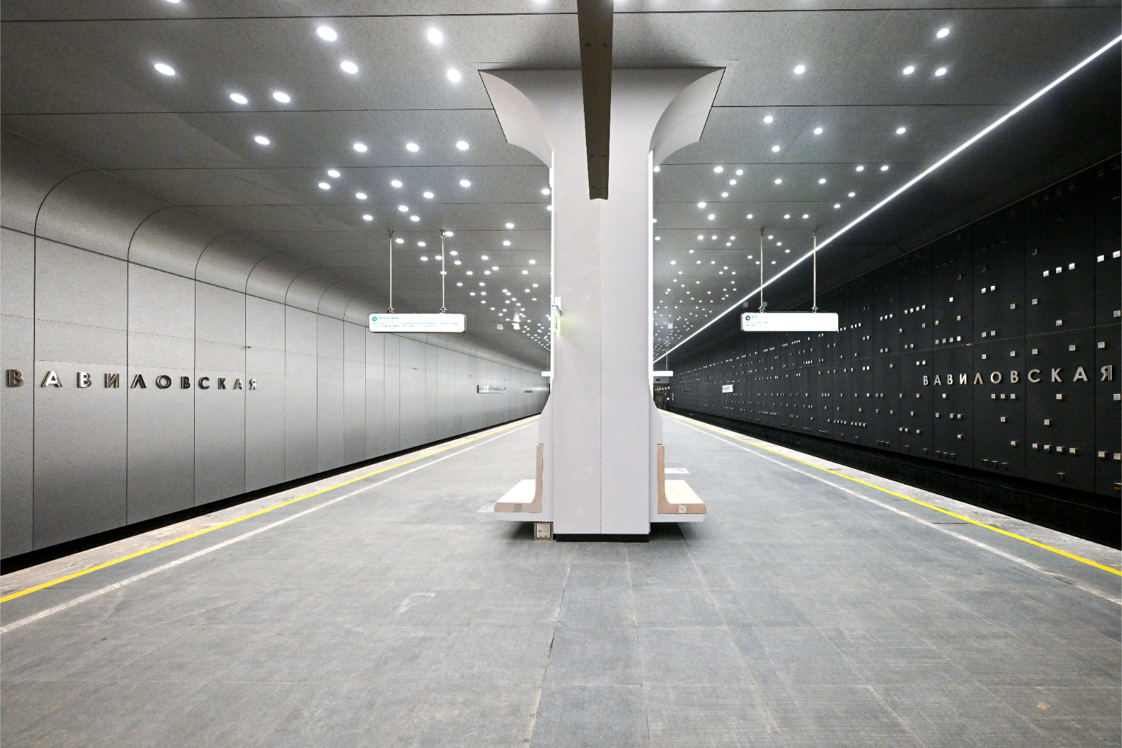 В оформлении платформы доминирует асимметричная композиция, где одна из путевых стен плавным изгибом переходит в плоскость потолка.