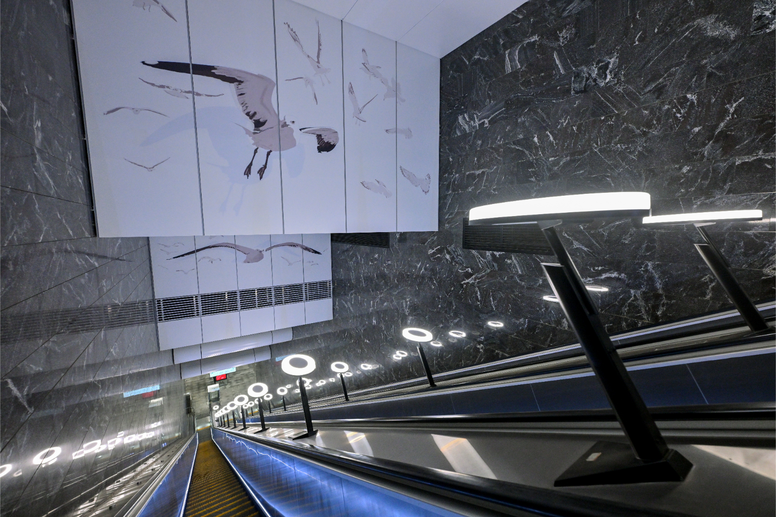 Эскалаторный наклон восточного вестибюля украшен изображениями парящих чаек, выполненными в технике печати на панелях облицовки.