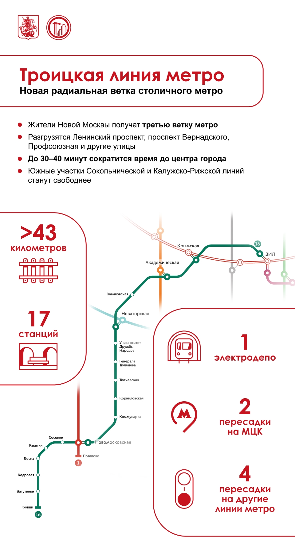 Троицкая линия длиной более 43 км с 17 станциями станет одной из самых протяженных в столичном метрополитене и самой большой за МКАД. Путь до центра Москвы уменьшится на 30-40 мин. Ожидается, что новая ветка придет в Троицк до 2030 года.