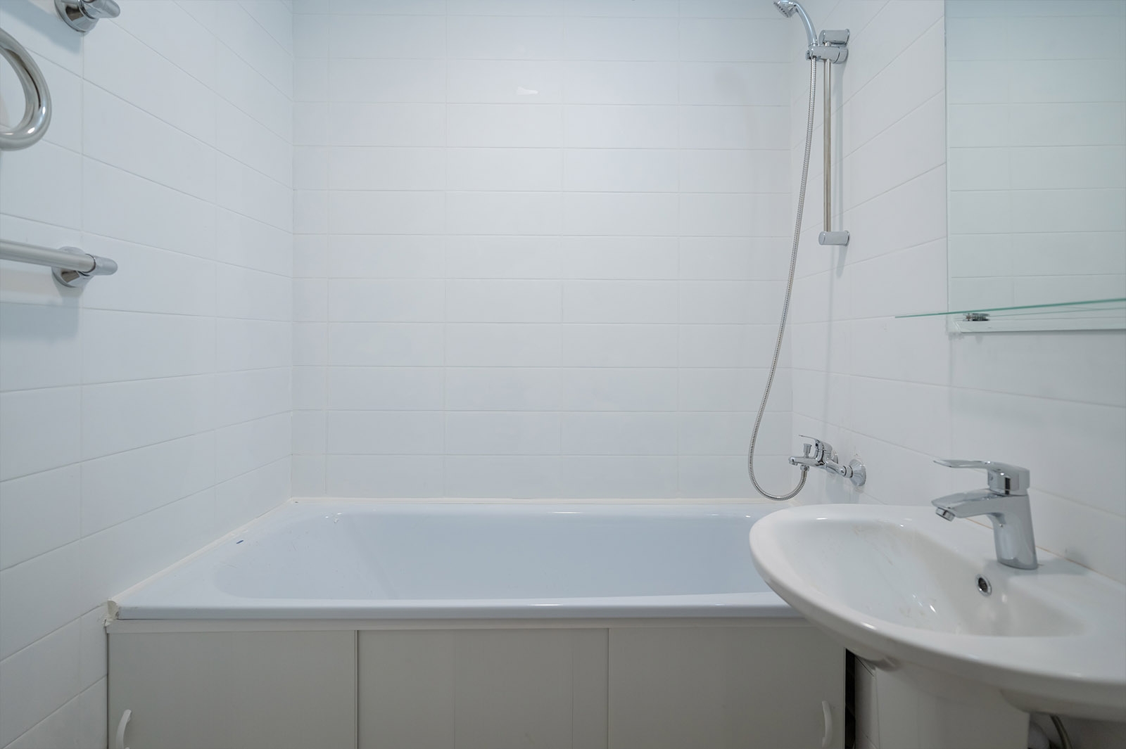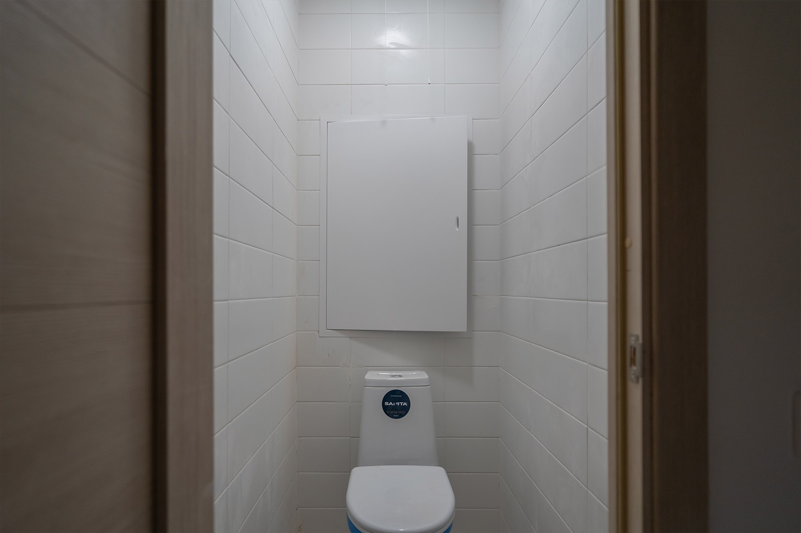 - в санузлах подвесной потолок, керамическую плитку, белую стальную ванну, белую керамическую сантехнику (раковину и унитаз), полотенцесушитель, водостойкий светильник;