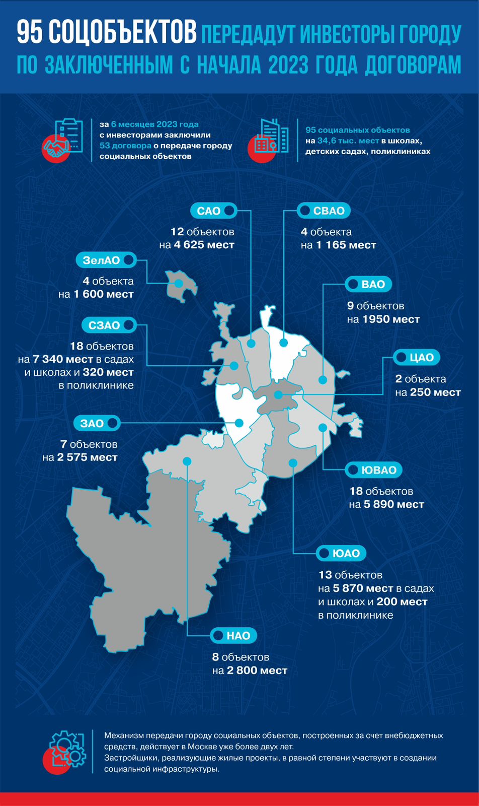 С начала этого года столичные инвесторы закрепили свои обязательства передать городу 95 социальных объектов почти на 34,6 тыс. мест, сообщил заместитель мэра Москвы по вопросам градостроительной политики и строительства Андрей Бочкарёв.