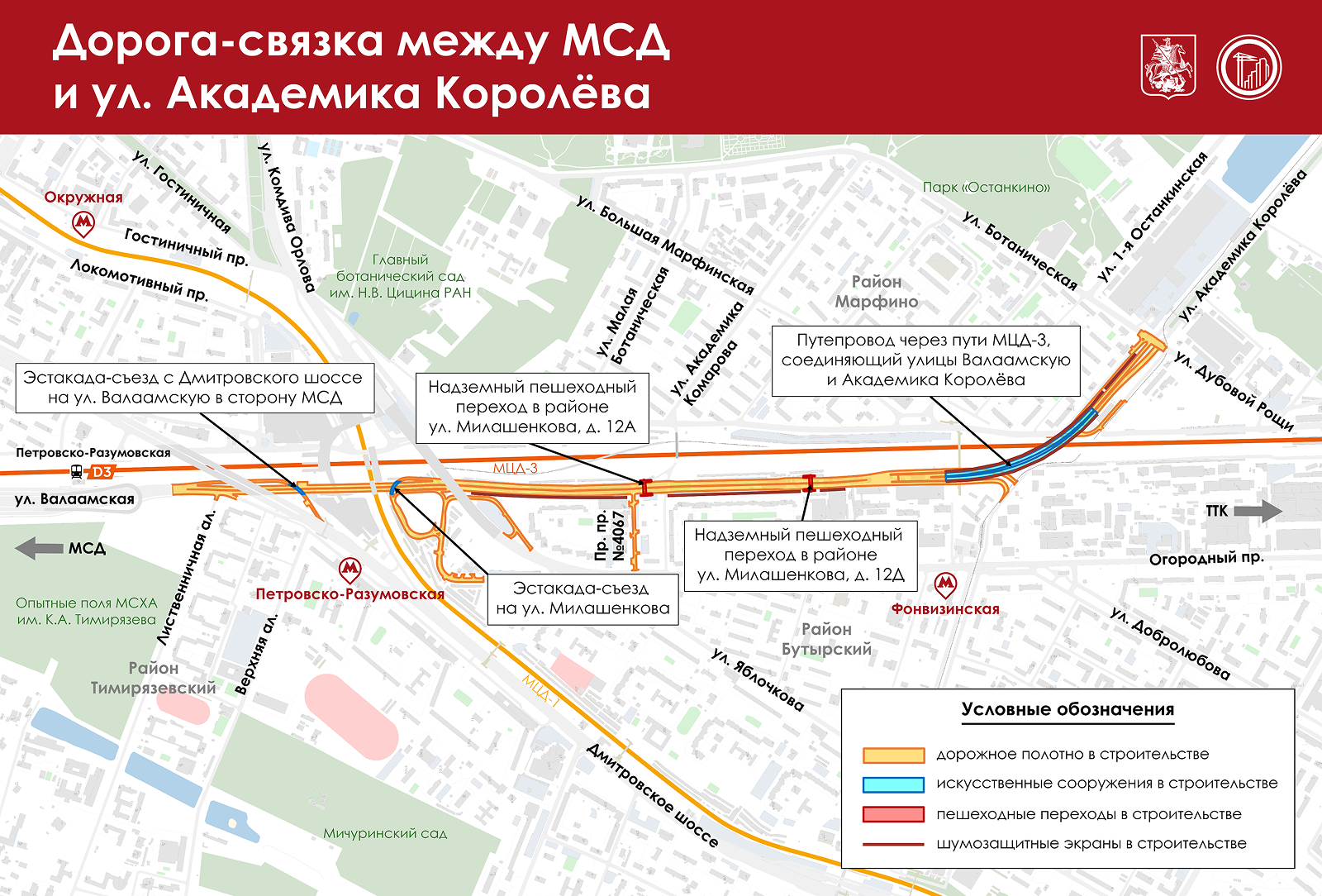 «Участок основного хода новой дороги протяженностью почти 3 км от ул. Валаамской до ул. Академика Королёва будет иметь от двух до трех полос движения в каждом направлении. Будет построена однополосная эстакада-съезд с Дмитровского шоссе на участок основного хода в сторону Московского скоростного диаметра», – уточнил руководитель столичного Департамента строительства транспортной и инженерной инфраструктуры Василий Десятков.