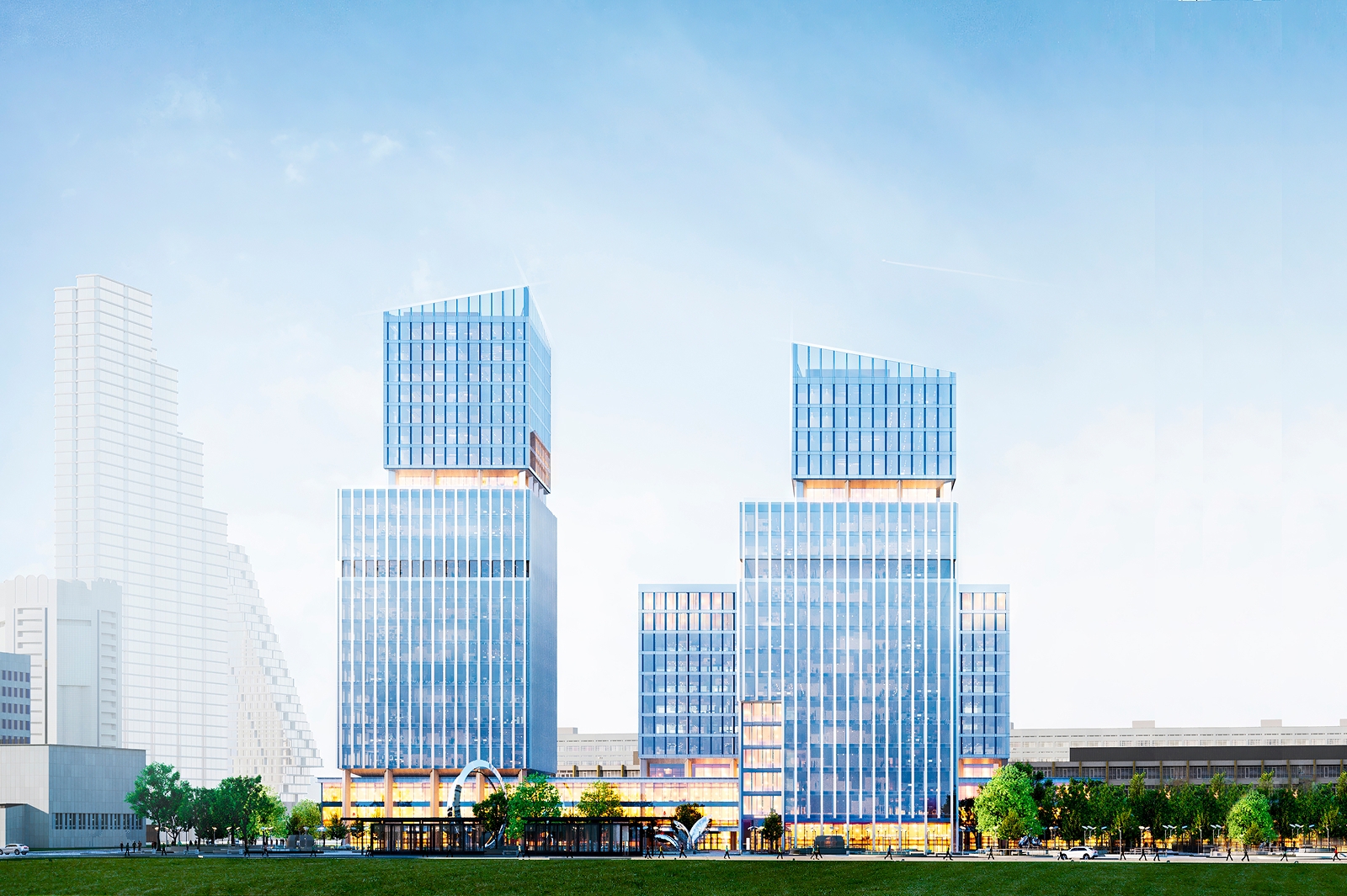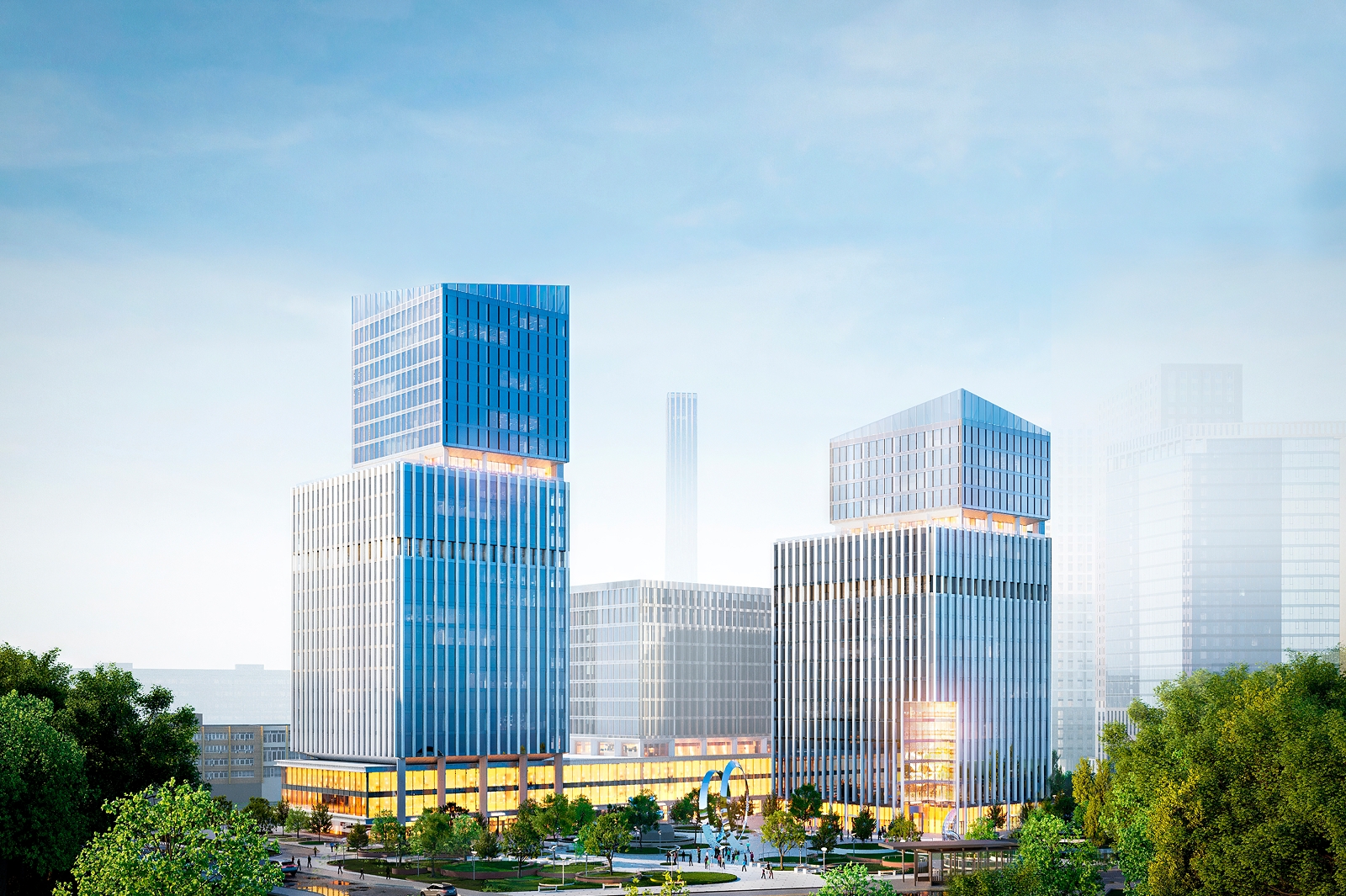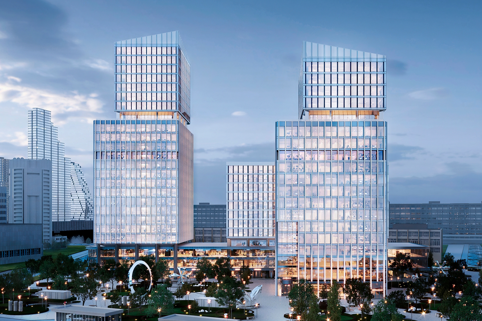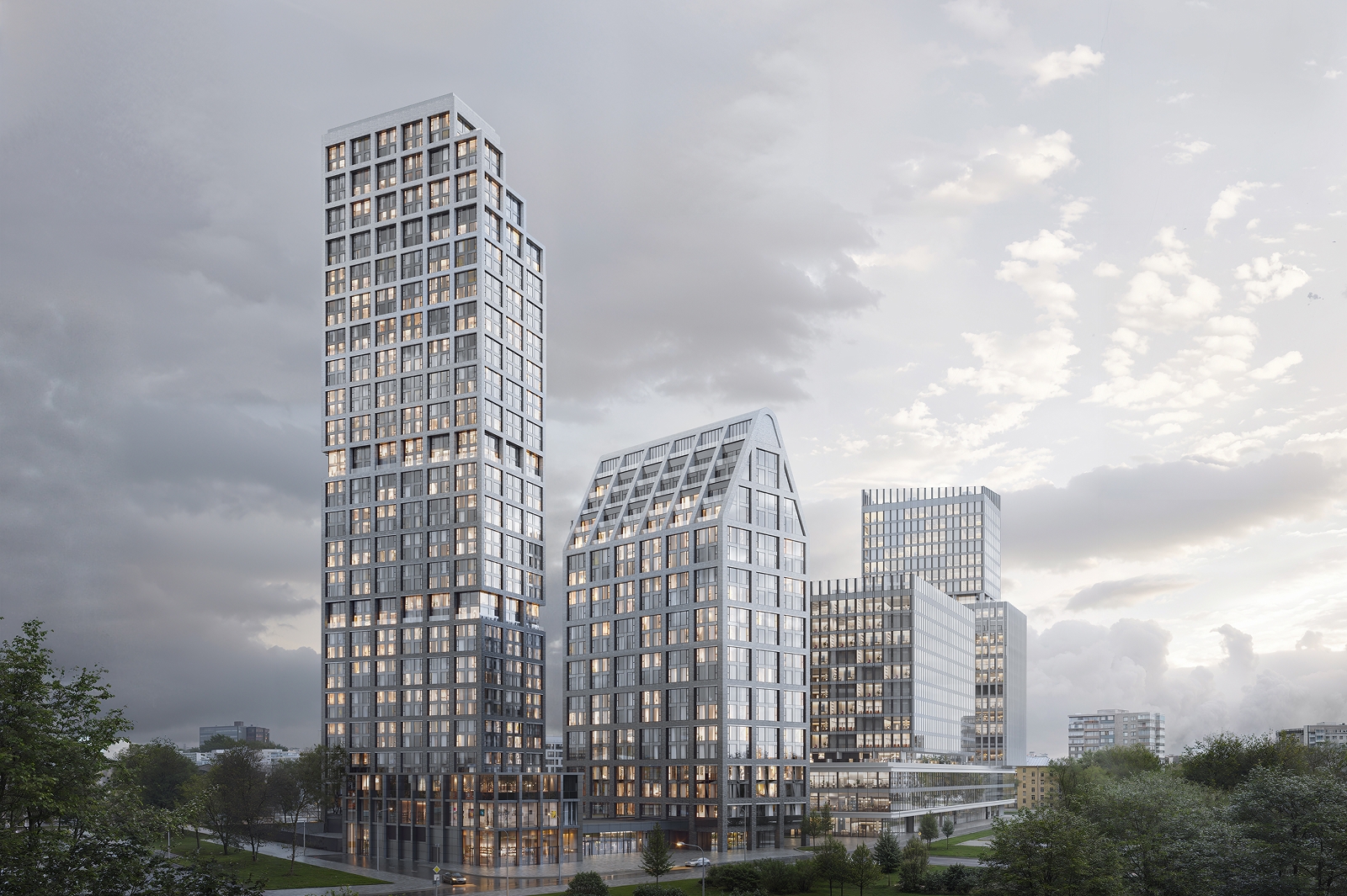 Архитектурная подсветка, разработанная компанией QPRO, концептуально объединит все три разновысотных корпуса офисного квартала с помощью световых градиентов на фасадах.