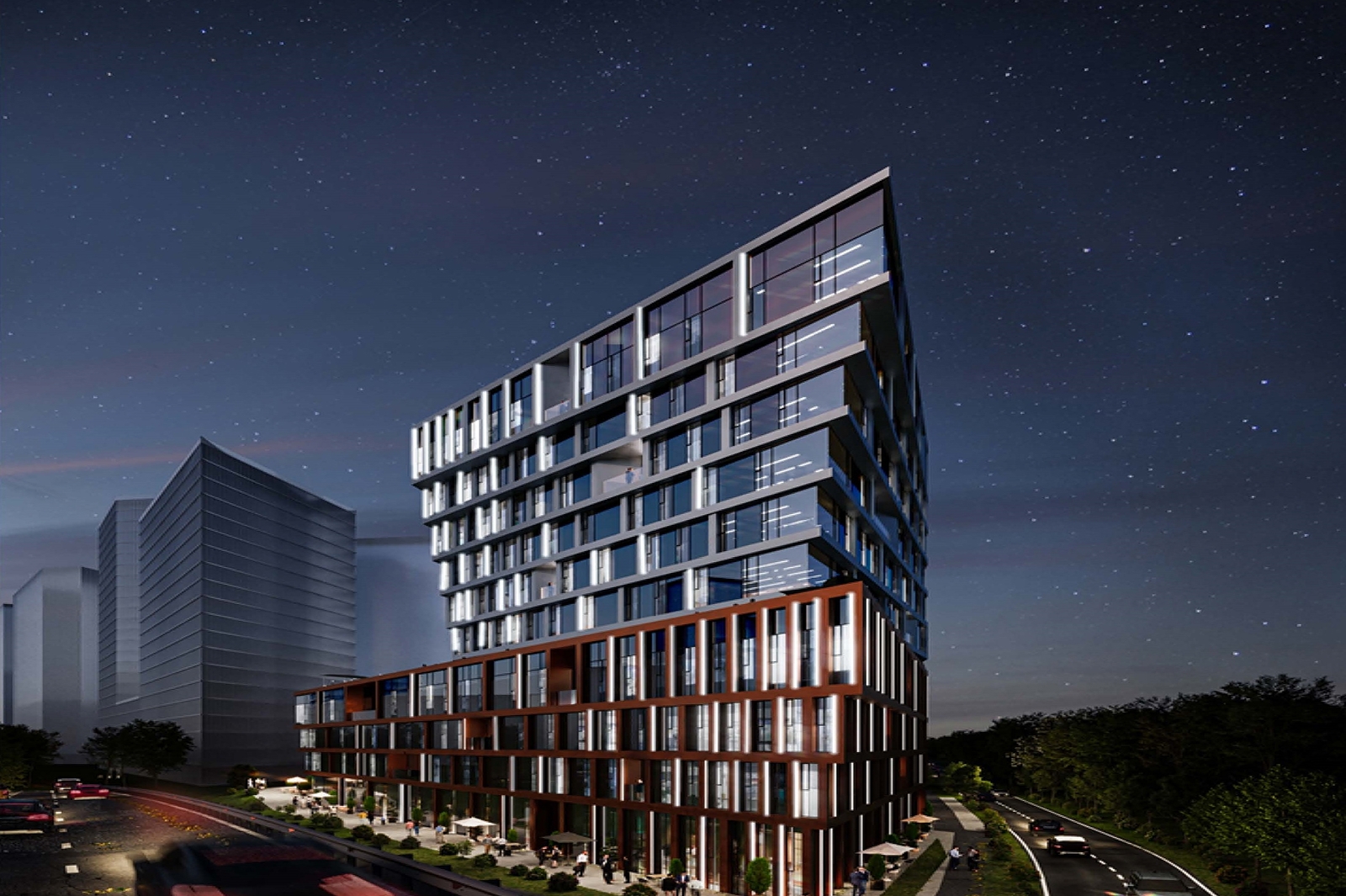 - фасады этажей с первого по четвертый оформят крупными металлическими панелями бронзового оттенка с полуматовой поверхностью и системой витражей со вставками из стемалита;