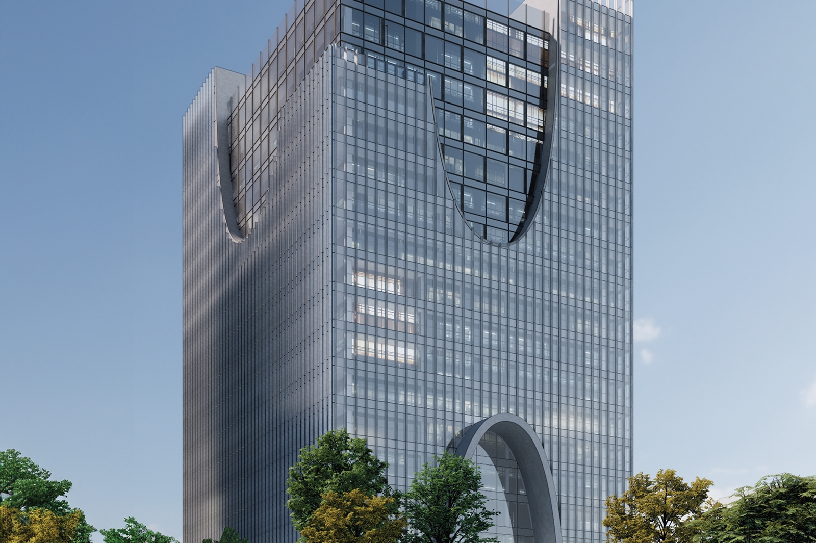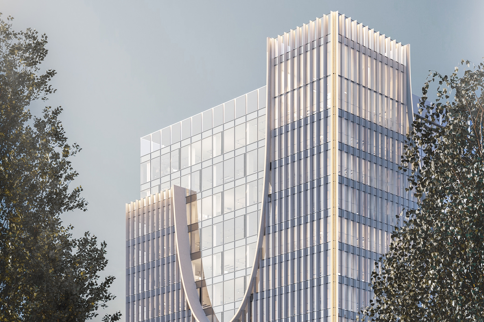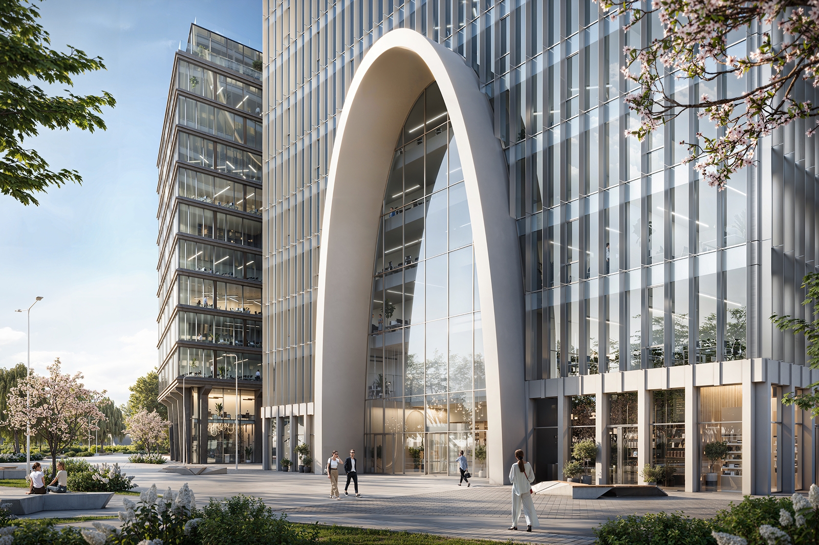 «Здание первой очереди бизнес-центра представляет собой прозрачную стеклянную призму, фасад которой будет выполнен с использованием металлических ламелей. Важным акцентом башни станут монументальные арки, которые выступают визуальными маркерами, соединяющими природу и урбанистику», – сказал Сергей Кузнецов.