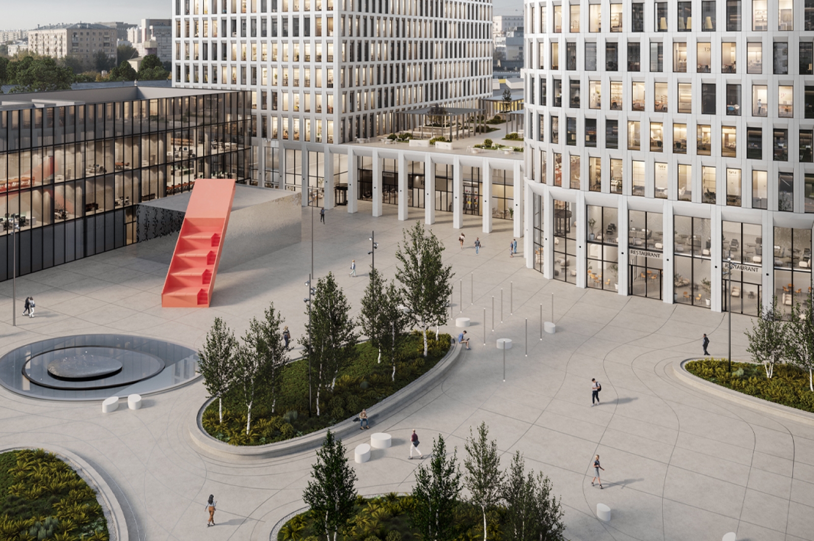Проект предусматривает активное озеленение и благоустройство участка площадью 1,5 га. Запроектированы две зоны: общественное пространство со свободным доступом и территория для резидентов с кафе на открытом воздухе. На главной площади бизнес-центра создадут зеленые островки и ландшафтные холмы.