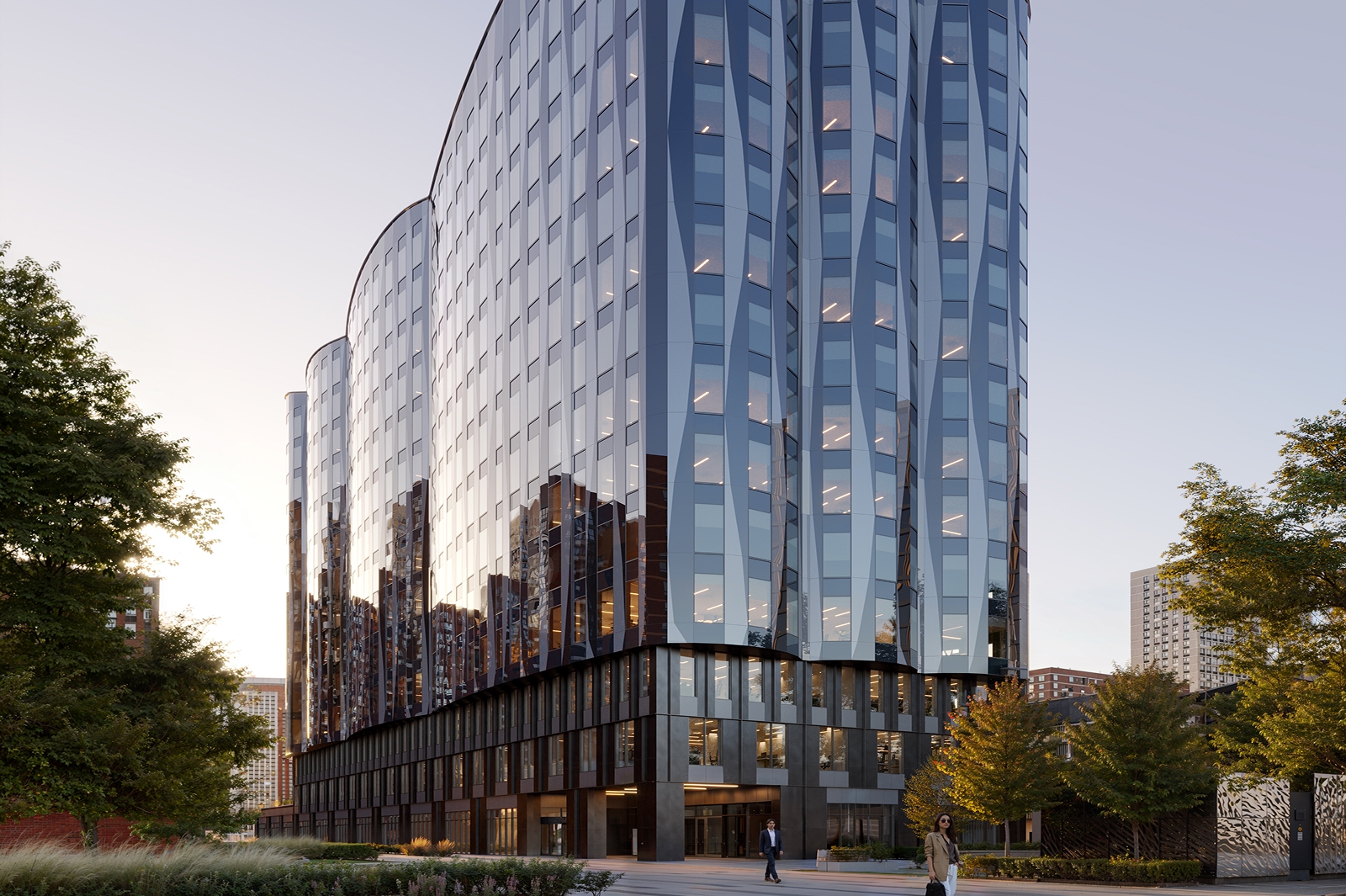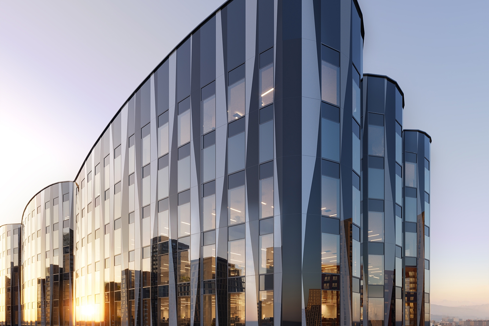 Глянцевые металлические панели отразят небо и окружающий ландшафт, интегрируя комплекс в городскую ткань. Двухцветная вертикальная композиция фасадов обеспечит динамичный запоминающийся силуэт.