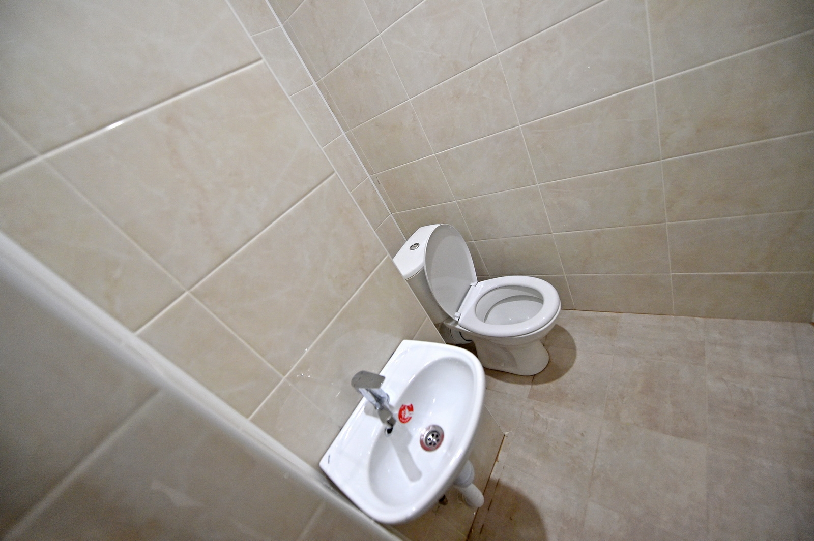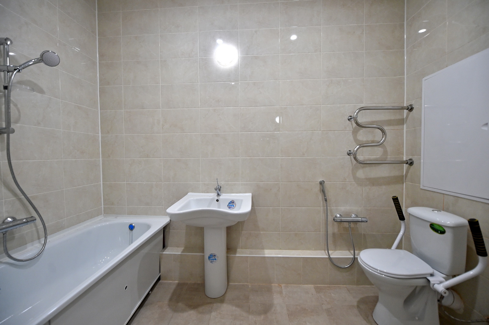 - в санузлах подвесной потолок, керамическую плитку, белую стальную ванну, белую керамическую сантехнику (раковину и унитаз), полотенцесушитель, водостойкий светильник;