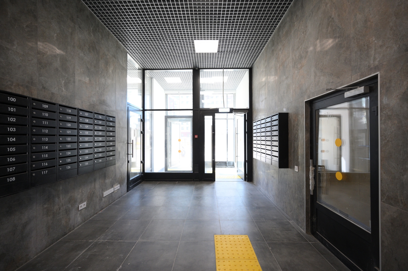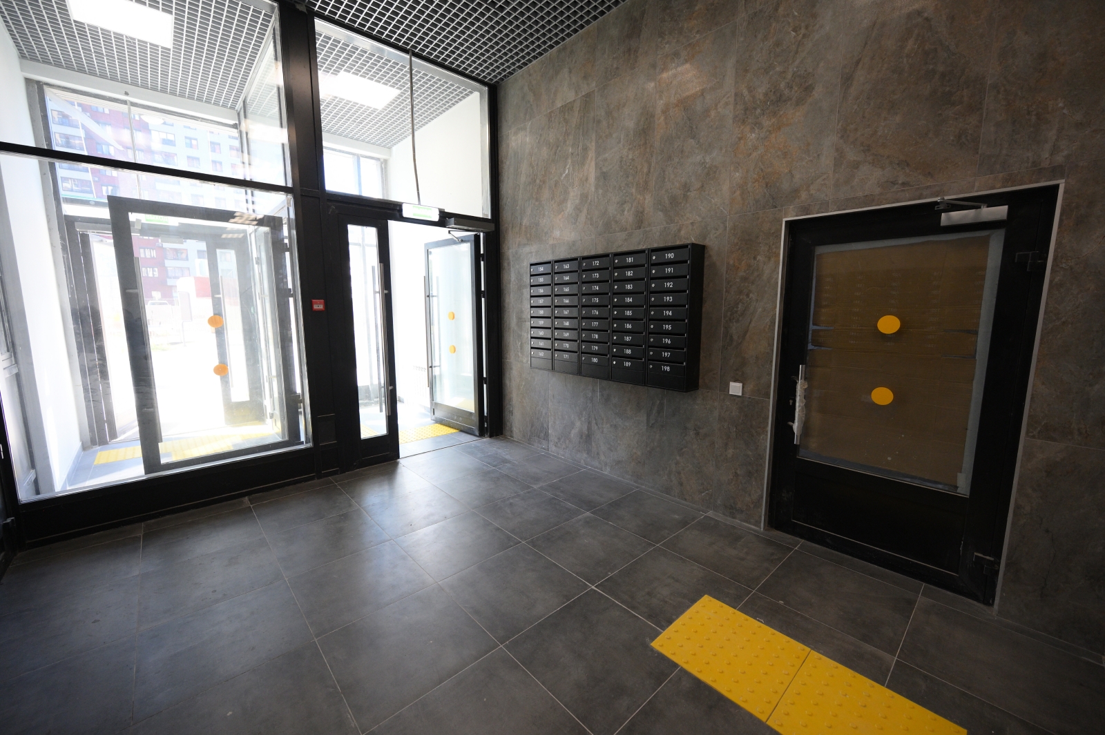 На первом нежилом этаже новостройки открылся центр информирования населения, а в будущем здесь появятся магазины, аптеки, пункты выдачи товаров, кафе и салоны красоты.