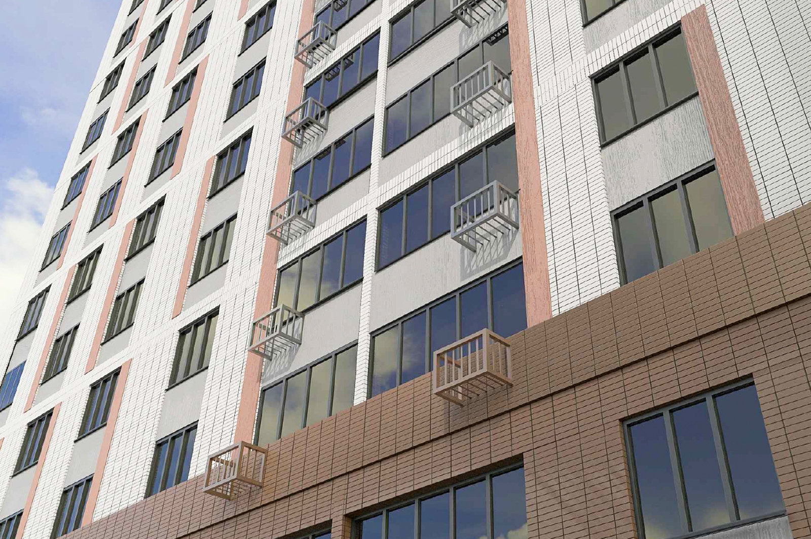 Фасады зданий выполнят из навесных трехслойных стеновых панелей, облицованных керамической плиткой из кирпича. На них установят корзины под кондиционеры. Входную группу оформят витражным остеклением.