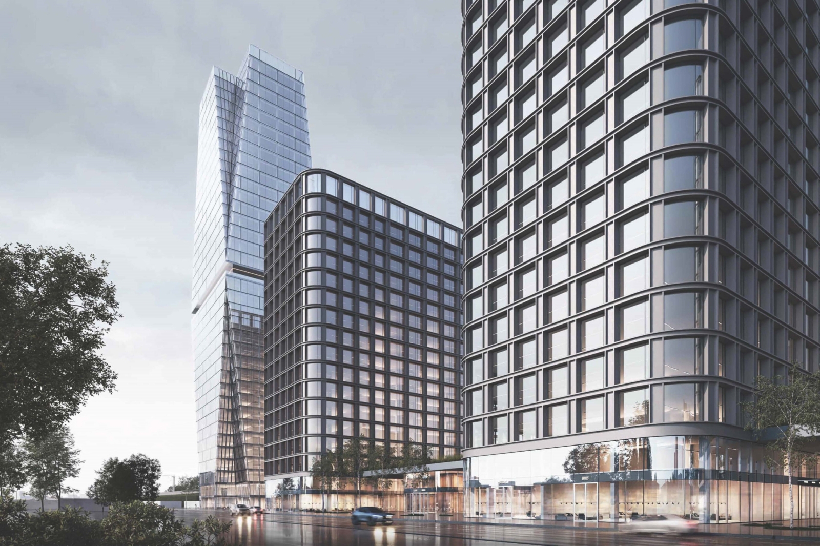 - три офисных корпуса высотой до 75 м со схожими архитектурными решениями;